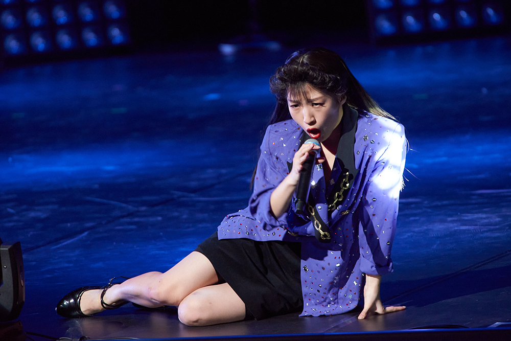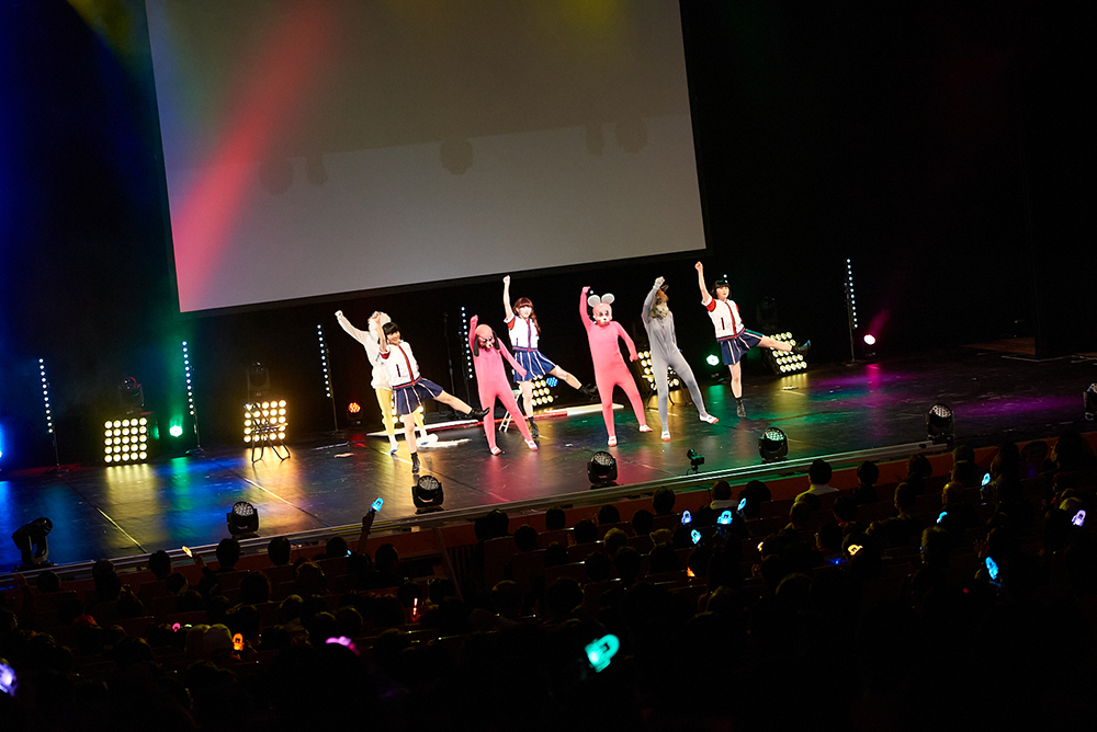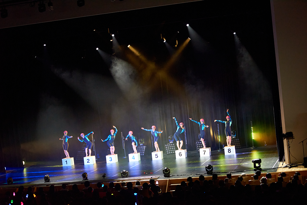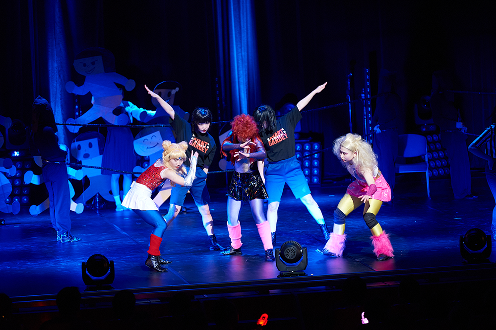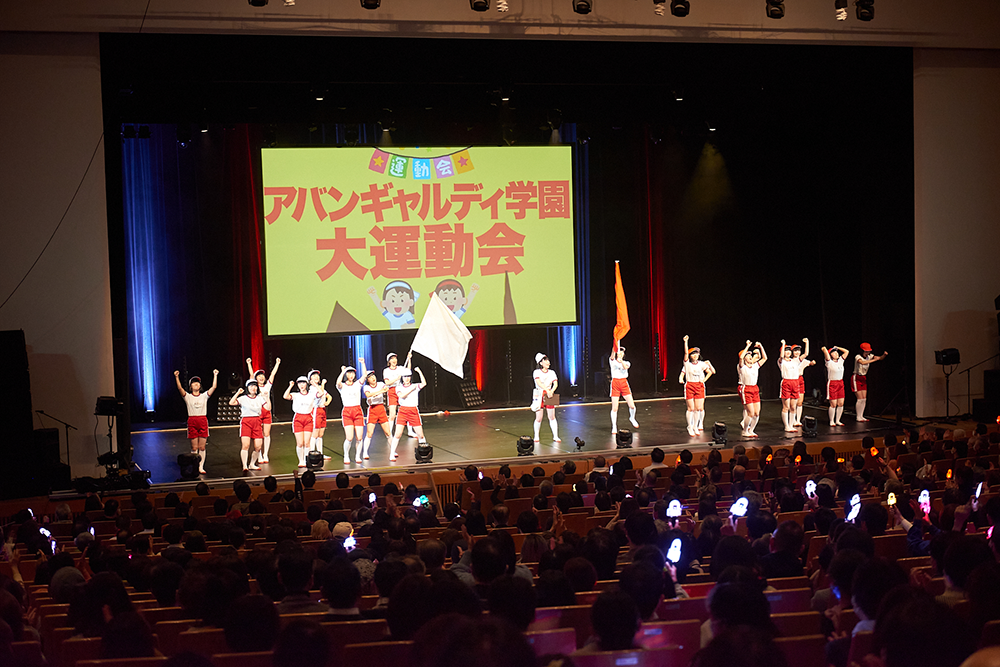 体操服に着替えたダンサーたちは、まず最初にラジオ体操で体を整えていく。もちろんこの体操もアバンギャルディ流にアレンジされていて、最後は全員が被っていた赤白帽を脱ぎ、猛スピードで頭をグラインドさせてヘッドバンギング!! これには場内も大爆笑。こうして少し(?)激しめな準備運動が終わったあとは、なんと観客も彼女たちの運動会に参加。大喜びしながら観客たちは応援部隊となって歓声をあげたり、競技に(かなり本気で)加わって「綱引き」、「大声対決」、「大玉ころがし」対決を行ない、この日は上手側の紅組が勝利を獲得した。こうして、運動会というアイテムを使って、学生時代にタイムスリップしたような気分でメンバーと一緒にライブを楽しませるエンタメ性の高いプログラムで、客席とメンバーの距離を縮めていったあとは、この学校最大のカリキュラムとなる文化祭へと展開。ここからは、メンバーが各々このために用意したとっておきの出し物を披露していく。