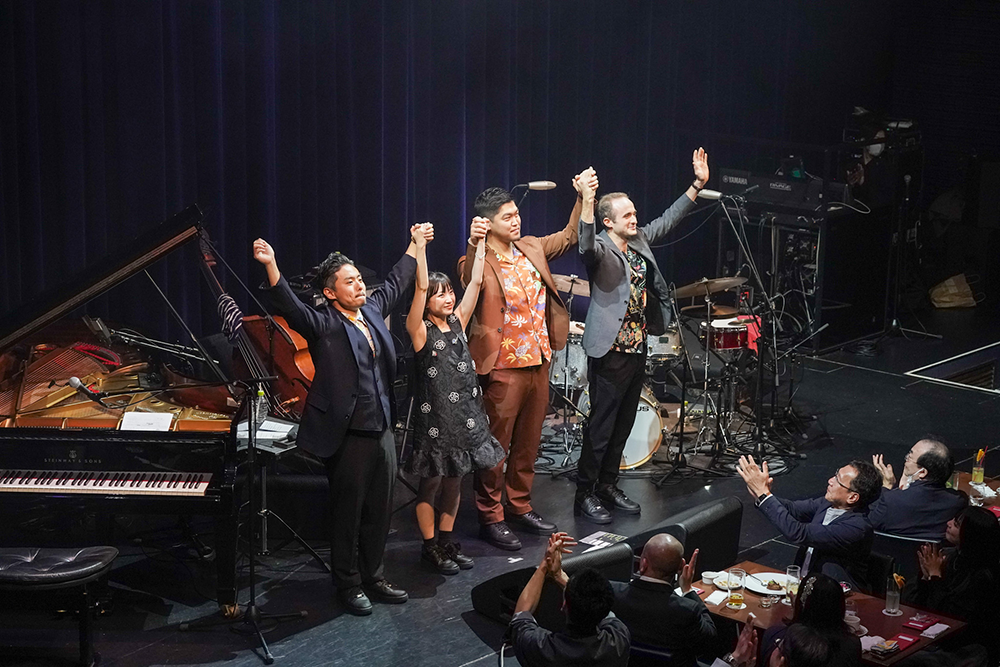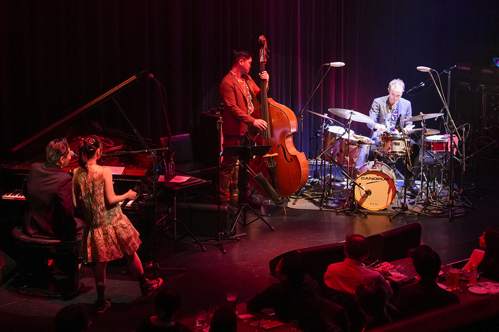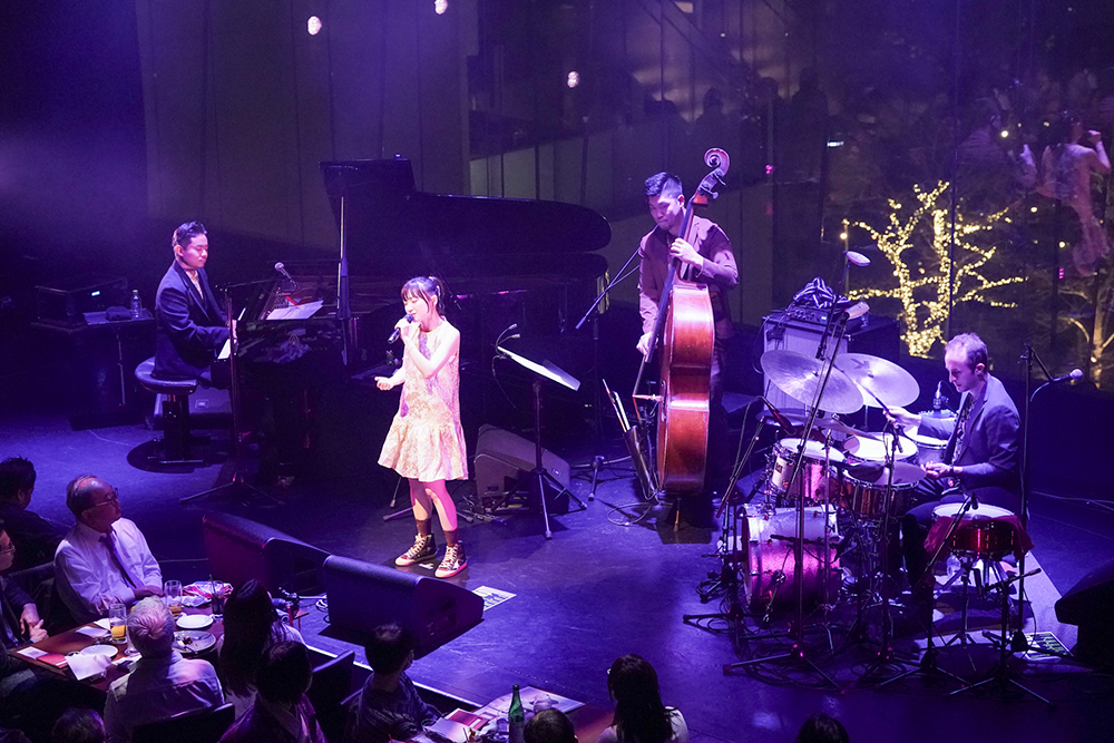 2ndステージでは、ヘリン・メリルの歌唱で知られる「You’d Be So Nice To Come Home To(帰ってくれたら嬉しいわ)」やミュージカルでお馴染みの「Over The Rainbow(虹の彼方に)」、アントニオ・カルロス・ジョビンによるボサノヴァの名曲「Corcovado」(ただ、これも同じくジョビンの「イパネマの娘」じゃなく、「コルコバード」を選ぶところが、有安らしい)など、ジャズに詳しくない人でも耳にしたことのあるスタンダードナンバーを歌唱。時には揺蕩うように、時には情感たっぷりに歌いあげ、自由で緊張感みなぎる<Jazz Note>の世界を最良の形で表現。特に、ピアノとヴォーカルのみの編成だった「Over The Rainbow」は音域の広い曲なのだが、「世界中に届くように歌います」と語った有安が、囁くような歌声から一気に空高くまで舞い上がるダイナミックなヴォーカリゼージョンをみせると観客からはこの日、最大の拍手が送られた。
