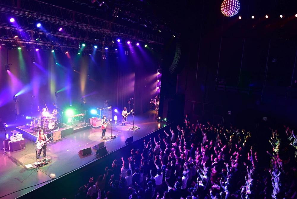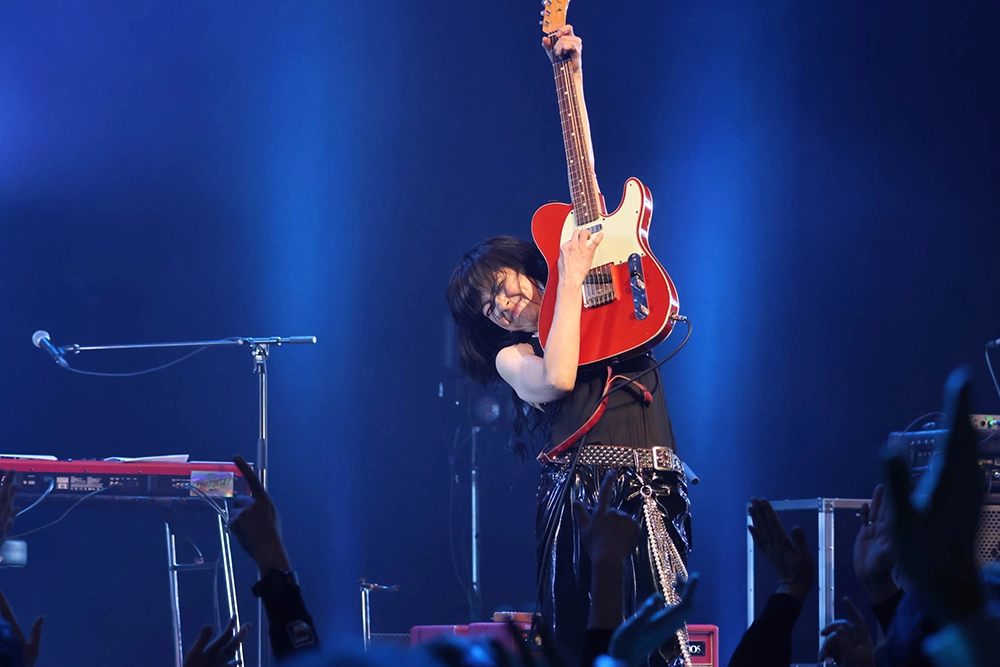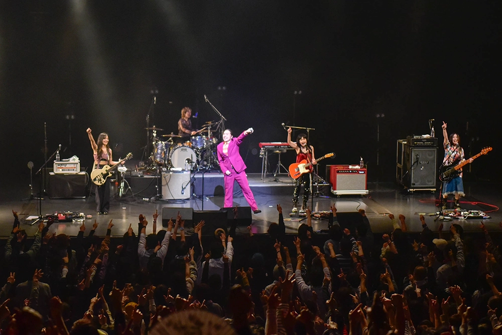 そして、後半のゲストはトータス松本。鮮やかなマゼンタのスーツに身を固めて登場したトータスが、ごくごく柔かに「行きますよ」と言った後にいきなり「イエーッ!」と叫んだその熱量の高さに、会場の空気もたちまち発火した印象。そしてすかさず「ガッツだぜ!!」が披露されたから、会場は完全にトータスのムードが支配することになったのだが、しかしその後に披露されたまさにスペシャルなウルフルズ・メドレーは、トータスの濃厚な個性とガールズ・バンドならではのしなやかなロック・ビートが印象的な化学反応を起こし、やはりトータス一人では生み出し得ない空気になっていったのだった。それは、なんとも楽しく、味わい深い演奏だったし、冒頭で紹介したブログの写真が告げていた通り、演奏している全員の“嬉しい!”が客席にも真っ直ぐに飛んでくる、実に心地いい時間だった。さらに言えば、ガールズの愛とリスペクトに満ちた演奏に押し出されて、トータスの黒人音楽ルーツや大阪フレイバーがすっきりと表現されたこの日のパフォーマンスは、トータスのファンにとっても印象深いものだったはずだ。