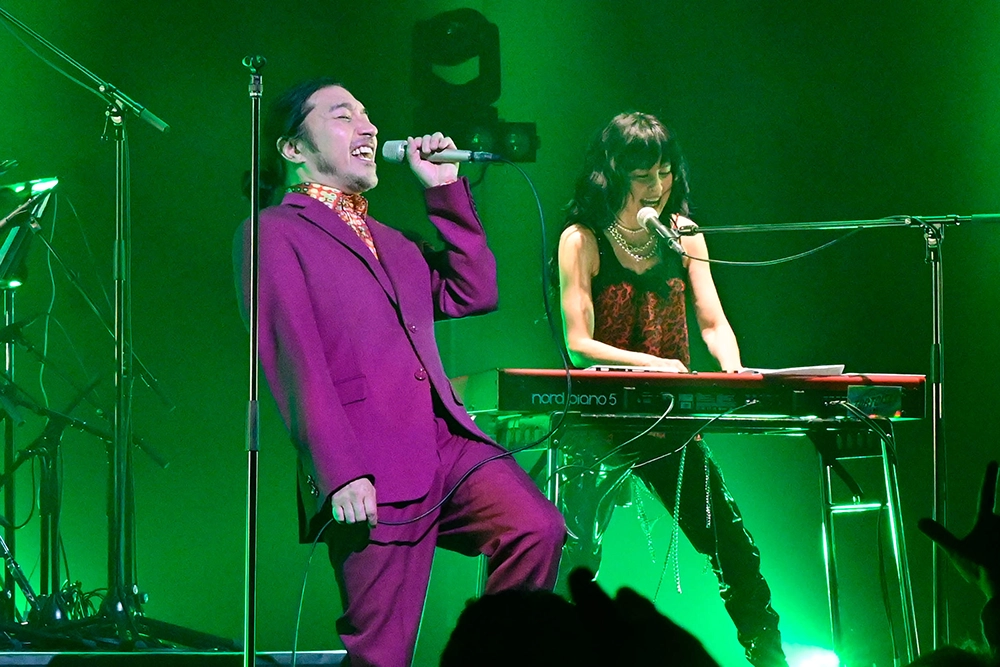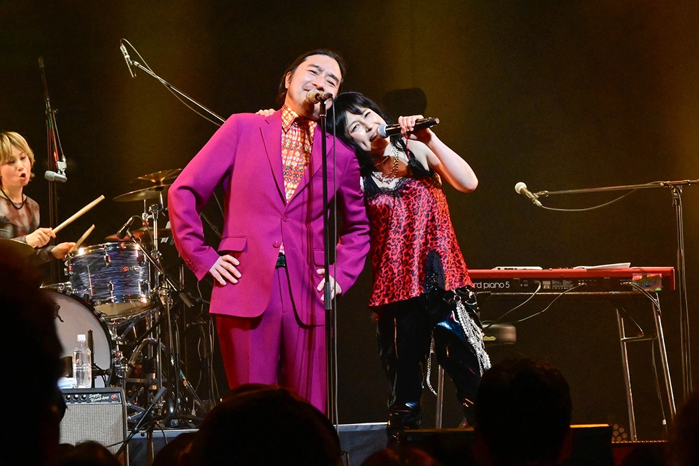 最初のパートは、まずシンプルな8ビートに乗って永井真理子が登場。代表曲「ミラクル・ガール」を披露して、会場の空気はたちまち「ポップン・ルージュ」が放送されていた1990年頃にタイムスリップ。同級生だという永井と岸谷のガールズ・トークに続いて、これまた永井の代表曲「ハートにWASH!」が始まると、会場から「オオーッ!」と歓声が上がった。おそらくはその時代を共有してきた客席の空気に応えるように、二人は「懐かしいね」話に花を咲かせたが、とは言ってもそれぞれにちゃんと今を生きている二人だから、「昔は良かったね」という話にはならない。「ここはダメだったけど、あそこを頑張ったから、今がある」という二人の気持ちを映し出すように、岸谷がこの日のためにアレンジしたという永井の曲「23才」はこの日最初のクライマックスになった。