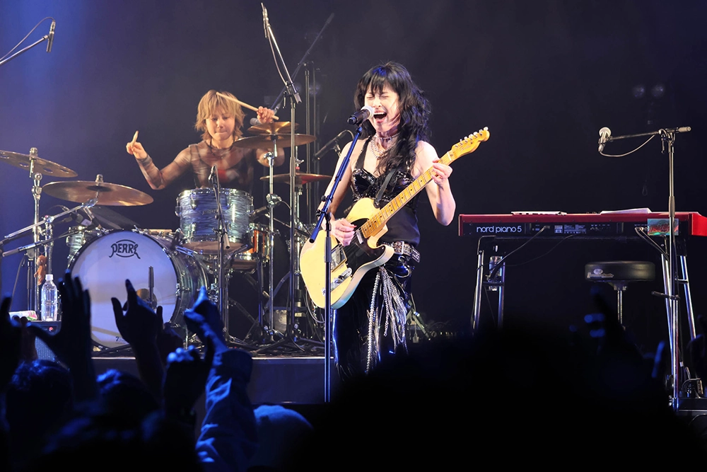 続くUnlock the girlsのパートでは、最新の彼女たちの音楽を凝縮したような内容で、昨年暮れのライブで初披露されたダンス・チューン「Beautiful」に始まって、岸谷の文字通り熱いギター・ソロをたっぷり聴かせた「Signs」まで、バンドの現在の充実ぶりをしっかりアピールしてみせた。