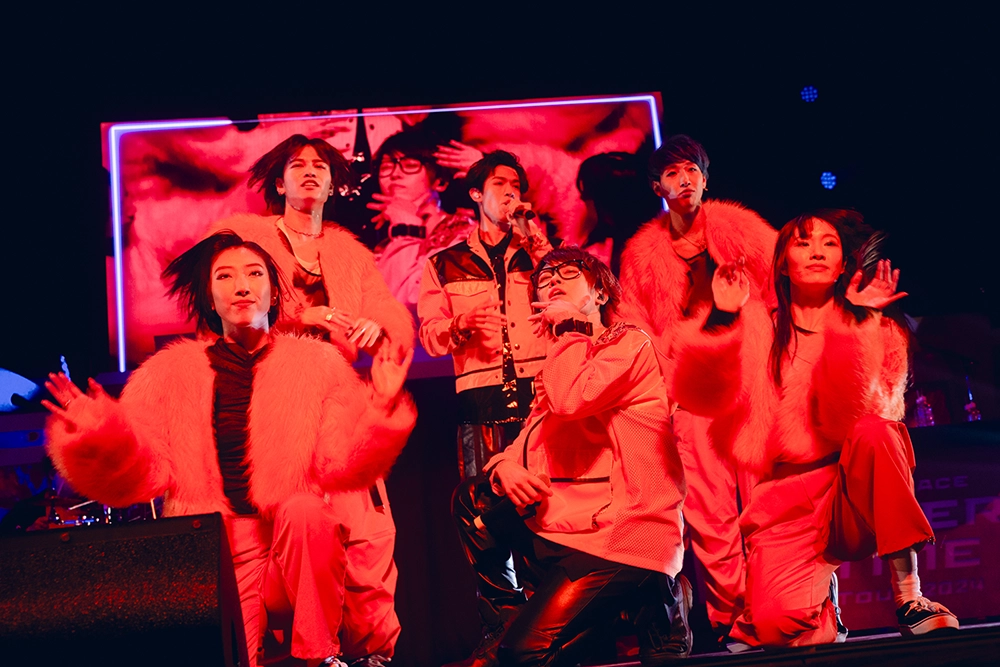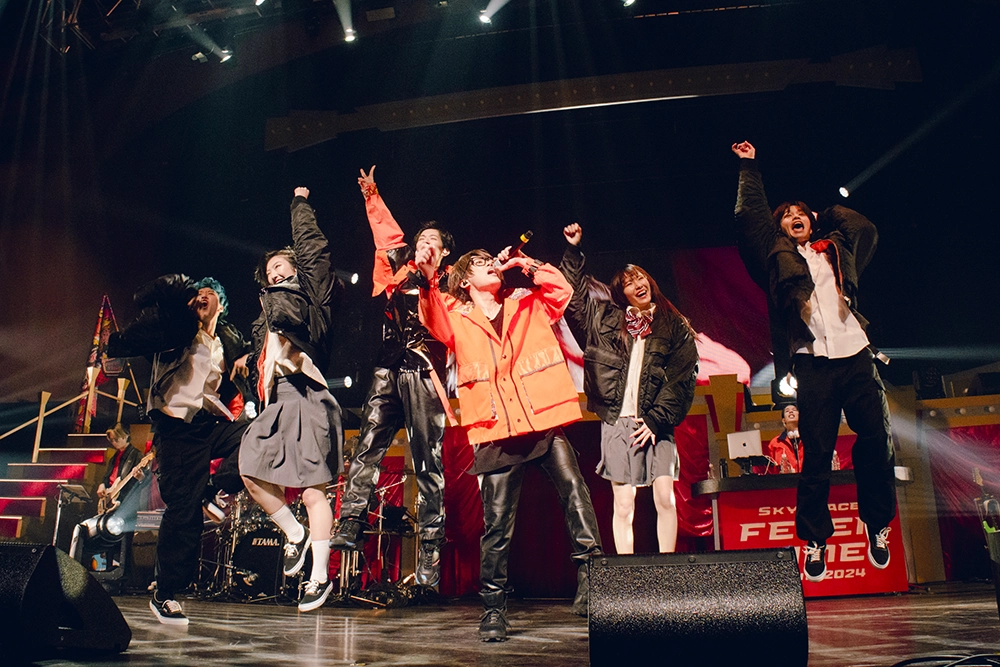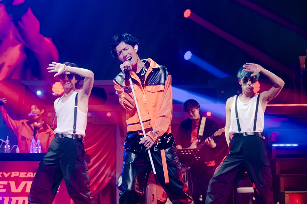 それぐらいあっという間だと感じたのは、中盤で披露された「俺的神曲メドレー」の存在も大きかったかもしれない。タイトルにあるとおり、ここでは自身の曲ではなく、洋邦問わず「神曲」を次々と歌い上げていった。ちあきなおみ「喝采」、きゃりーぱみゅぱみゅ「ファッションモンスター」、放課後ティータイム「Cagayake!GIRLS」、クイーン「Don’t Stop Me Now」といったぐっちゃぐちゃな選曲の時点でイカれてるが(褒めてます)、合計18曲に及ぶメドレーというのは前代未聞だ。メンバーとスタッフ一同、泥酔しながら決めたんじゃないかと思うぐらいぶっ飛んだ挑戦だったと思う。しかも、演出も含めて全曲全力。曲によってはしっかりダンサーも登場するというこだわりよう。スカイピースが普通のアーティストではないという特性を生かしたこのメドレーはかなりインパクトがあった。