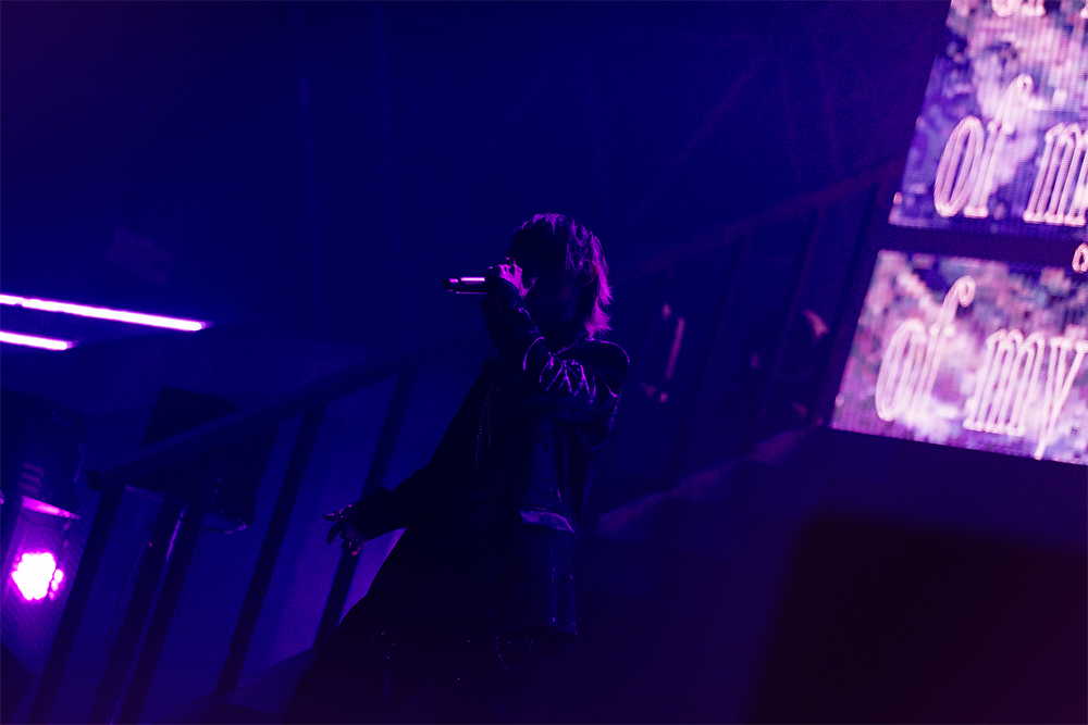 モニターに夜の遊園地からサーカスに迷い込む映像が流れると、メンバーカラーのジャケットを羽織り、右半分にピエロの仮面をつけた6人が登場。「アンダーリズムサーカス」へとなだれ込む。会場をたちまちミステリアスなムードに包み込むと、「d0gmq」ではさらにダークでクールなパフォーマンスを見せる。6人の声の個性が花開けば開くほど不思議な調和が生まれ、観客をさらにシクフォニワールドの奥深くへと引き込んだ。