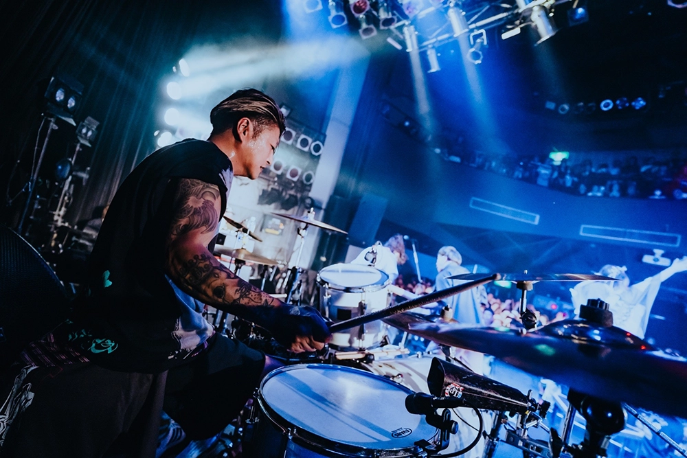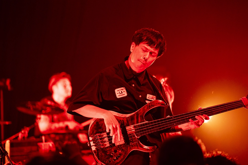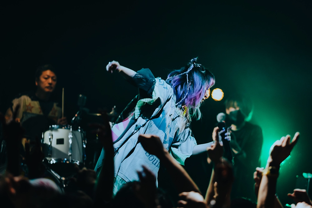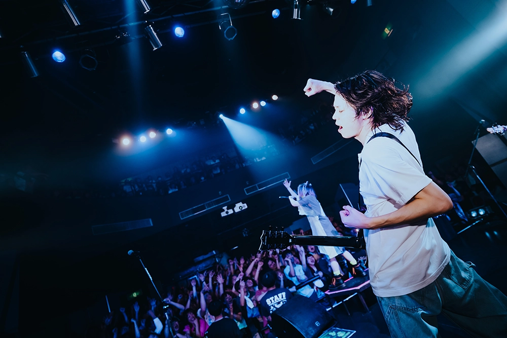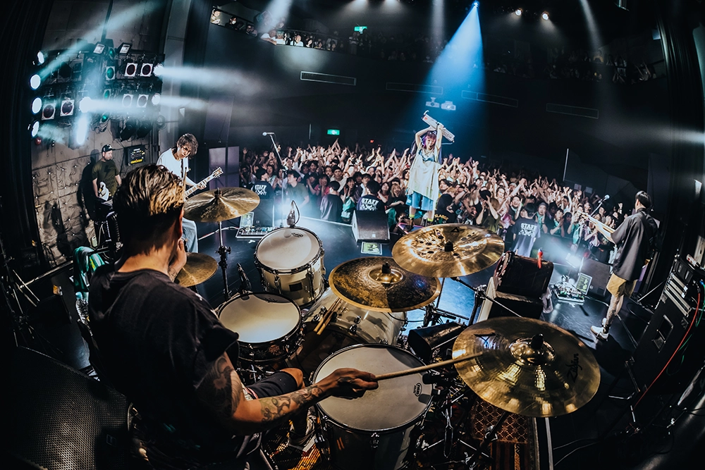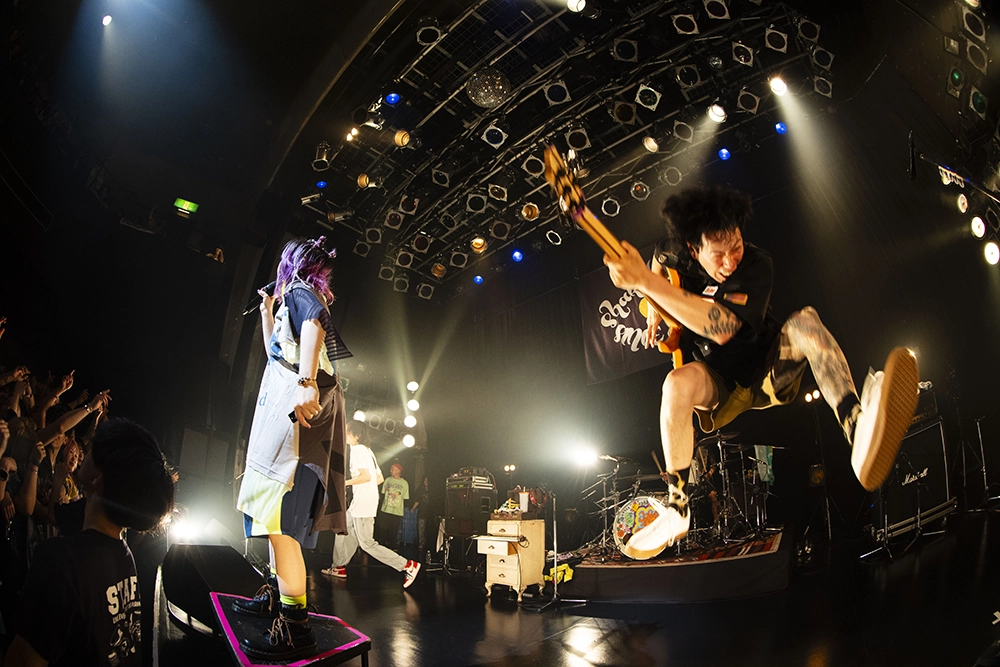 この時点でフロアは早くもサウナ状態となっており、UQUIは長袖のジャンパーを脱いで、「Yah Yah Yah!こんばんは、SHAKALABBITSです」と挨拶。「おかえりー!」という声が上がる中で、UQUIは「ただいま。ありがとう。待ちに待った感じです」と答え、熱気とテンションが上がりまくっているフロアに向けて、「7年前を思い出して、無理のないように、助け合っていきましょう」と呼びかけた。IKKEとko-heyのシャウトが轟く「GO」、最後にみんなでピースサインを掲げる「SO EXCITED!」、UQUIの指揮で高らかなシンガロングが響き渡った「head-scissors」とバンド初期からライブでお馴染みのアグレッシブなナンバーが立て続けにパフォーマンスされると、フロアは更なる熱狂の渦へと巻き込まれていった。