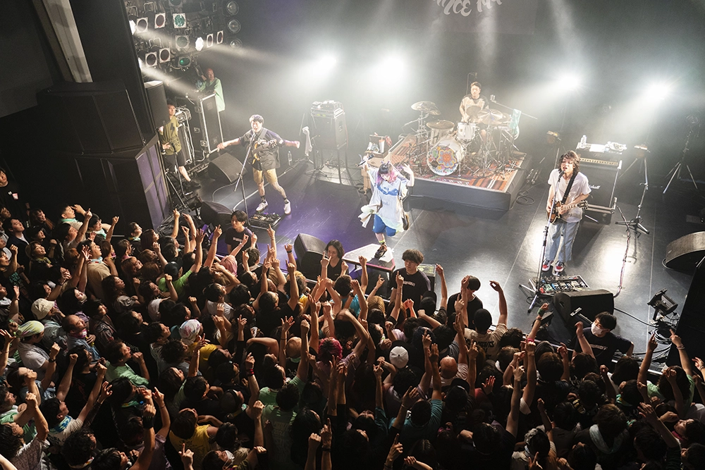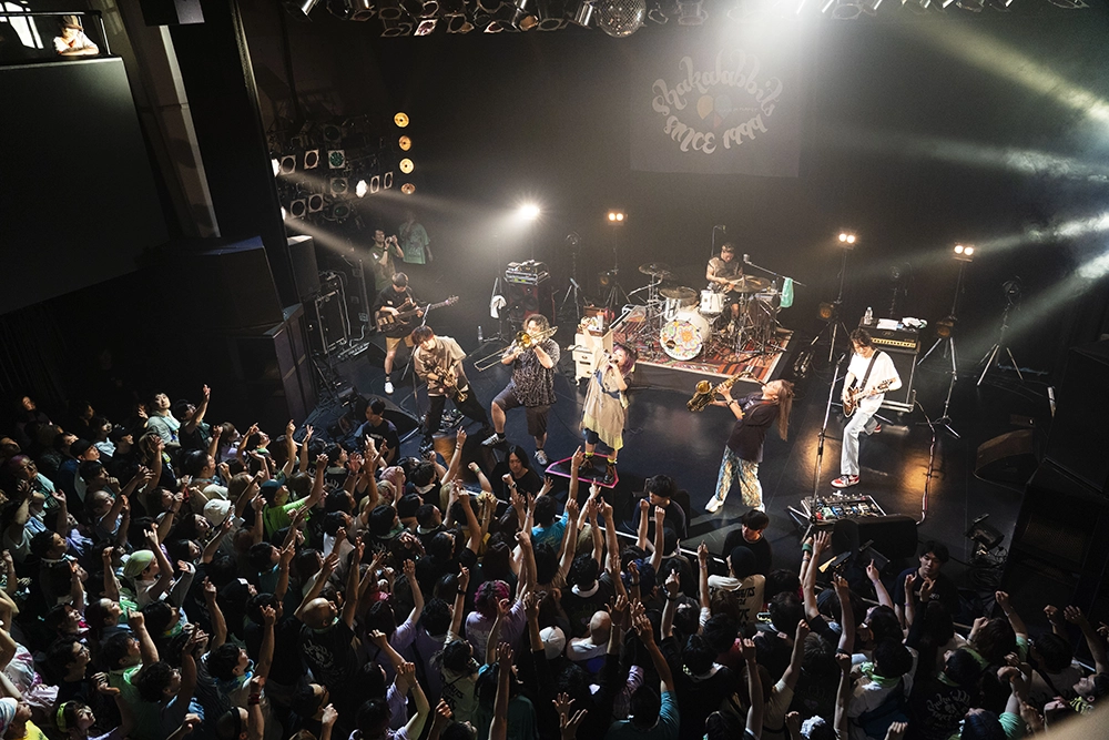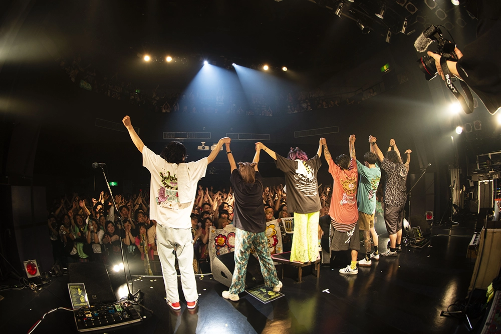 また、点滅する照明に合わせてオーディエンスが手をあげて歌った「少年と白い犬」では、UQUIがオーディエンスに向けて「かっこよ」と呟くシーンもあり、UQUIが鍵盤ハーモニカを手に、「7年ってなんだろうね。それぞれにいいことも悪いこともあって、みんなが壁を乗り越えてきて。いろんなことがあっても、今日に繋がっていると思ってる方が幸せじゃないか。今日、この1日のために全てがあったとしたら、すごくミラクルで、とても素敵だな。嬉しいな。みんな、今日、来てくれてありがとう。喜びも悲しみも全部がみんなのスパイスになりますように」という言葉に導かれた「SPICE!」では会場が揺れるほどの大合唱となった。そして、「80」のコール&レスポンスによってさらにヴォルテージが上がったところで、テナーサックス、トランペット、トロンボーンのホーン隊を迎え、ハレアコの10年とMuvidatの7年で得た音楽的な充実もしっかりと体現してみせた。そう、楽曲は確かに過去にリリースした懐かしいものではあるが、この日、鳴らされた音は間違いなく現在進行形の今しか出せない音だという実感があった。