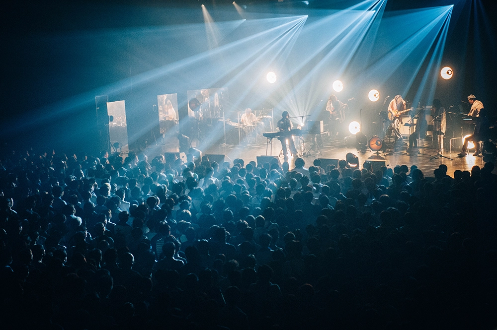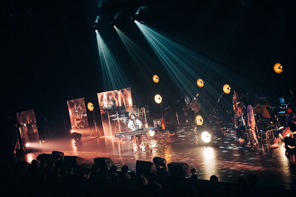開演時間を迎えると、まるで散歩の途中かのようなラフな足取りでバンドメンバーとともに姿を現したTOMOOは、そのままバンドメンバーと一緒にステージ前方に座って、スタンディングでぎゅうぎゅう詰めになった満員の観客に向けて軽く挨拶をした。そして、ピアノの前に座り、すうっと息を吸い込むと、スクリーンに大きな月が浮かび上がった。オープニングナンバーは映画「君は放課後インソムニア」主題歌に起用された「夜明けの君へ」。<眠れぬ夜に 届いた光>というフレーズに合わせるかのようにステージ後方から眩い光が照らされ、次第にフロアが真っ白い光に満ち満ちていき、TOMOOはその歌声で低く力強い歌声で朝を引き連れてきた。