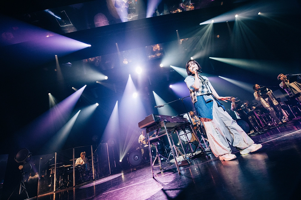 聞き慣れない“Puddles”という単語は“水たまり”という意味。MCで説明もあったが、雨上がりに道路に水たまりができる梅雨の季節に開催されたツアーであると同時に、彼女の楽曲に対する新たな視点も与えてくれるタイトルになっていた。例えば、彼女の曲には月や星が出てくる。それが、夜空を見上げた月や星ではなく、水たまりに映った月や星を眺めているのだとしたら。それだけで聴き慣れたはずの楽曲から想起される情景も変わってくるし、彼女の楽曲によく登場する“光”ではなく、“雨”に焦点を当てることで生まれる選曲の妙も楽しめるライブだった。