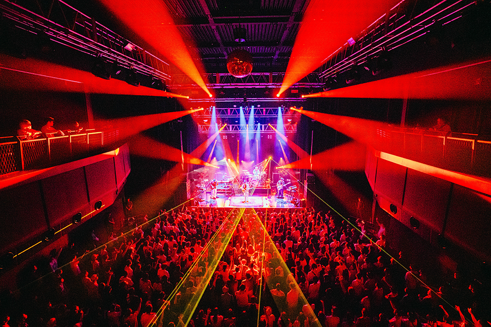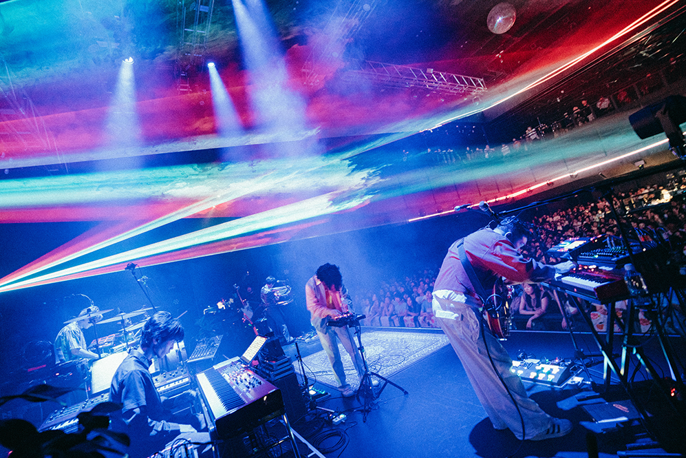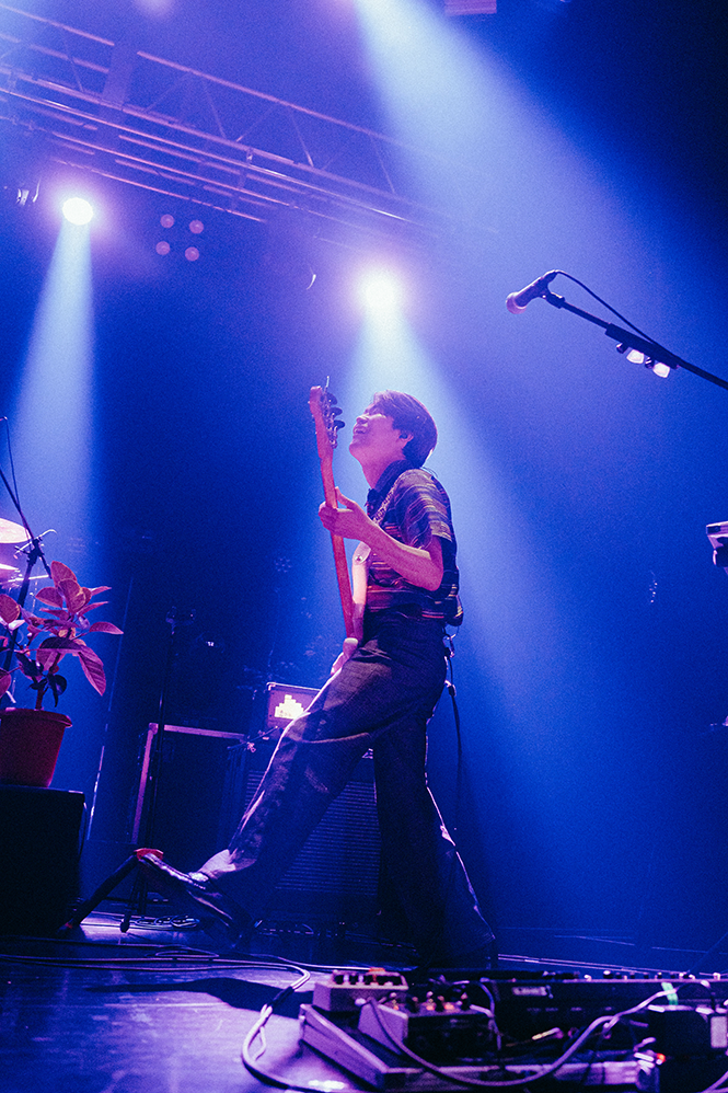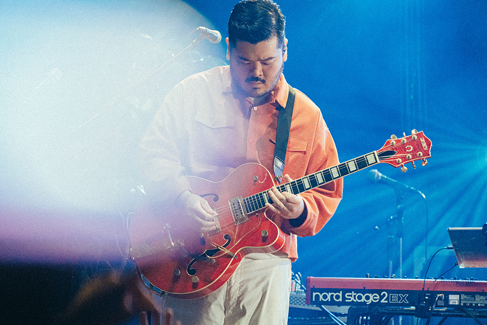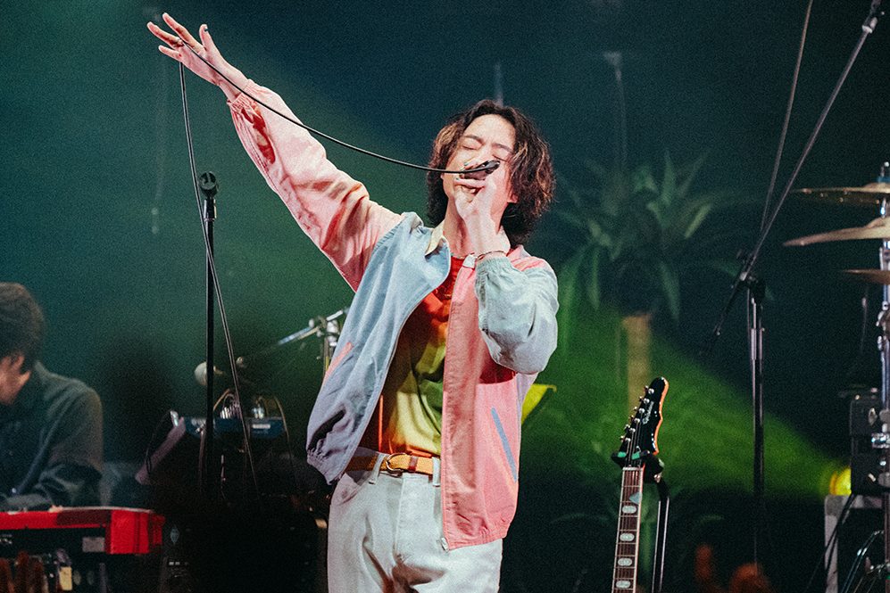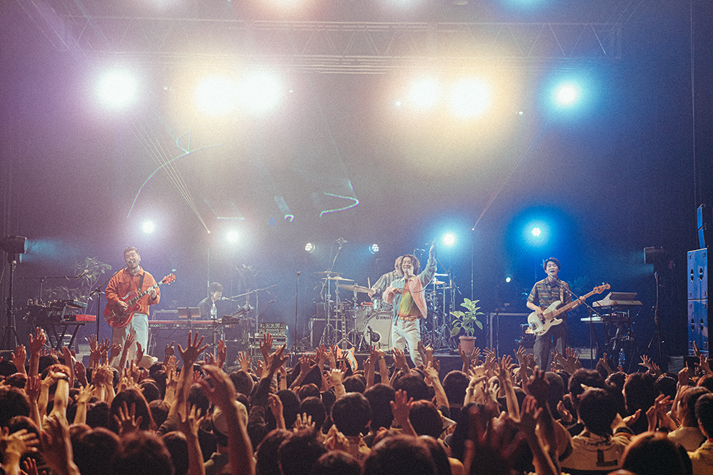 波音とカモメの鳴き声のSEに乗ってメンバーが登場すると、ブルーのレーザーを照射してバンドロゴが描かれる。HIROSHI(Vo/Gt)の「よう来たな!」の一声も相まってスターターの「Perfect Vacation」がフロアを真夏に変えていく。サビでは早くもシンガロングが巻き起こりパーティ空間が作り上げられる。そのムードをさらに盛り上げる「Sunshine」ではSHUN(Ba)がステップを踏みつつプレイし、楽しさを全身で表現。鬱陶しい気分を跳ね除けるポップソウル「Don’t Be Someone Else」では短い“ほら答えはいつでも胸の奥に、暗闇でも〜”の日本語詞が鮮明に胸に届く。サポートメンバー山本健太(Key)の存在がアンサンブルにリッチさを加味していて、生音の豊かさで魅了していく。