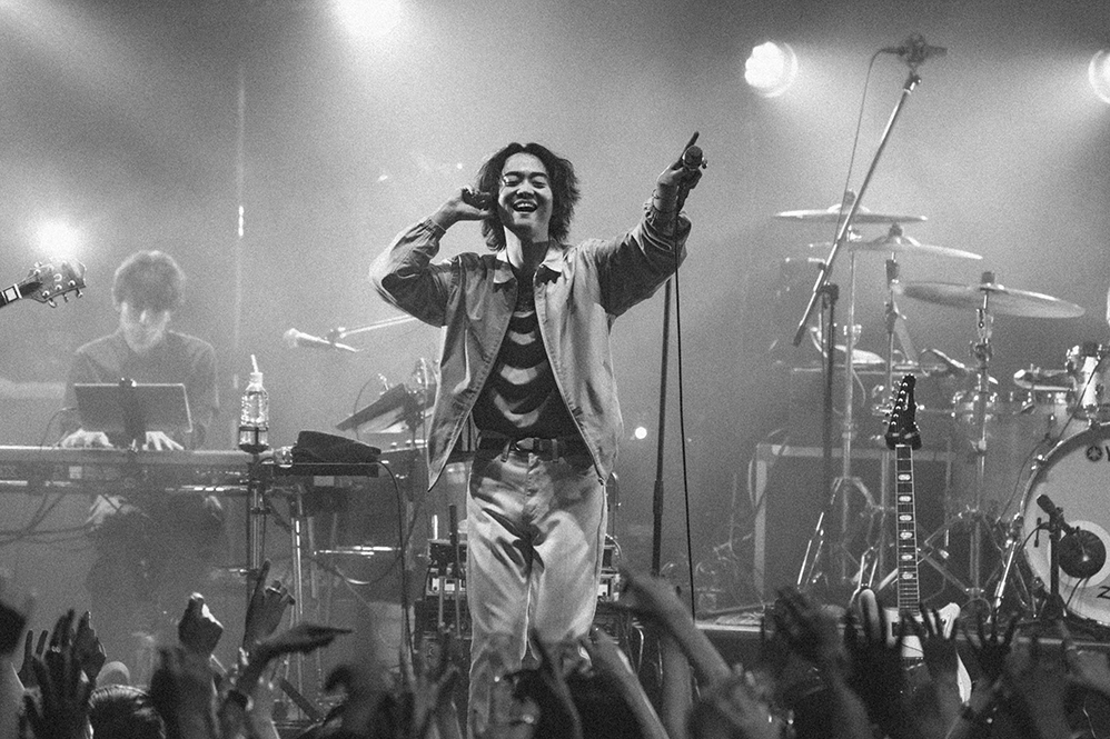 ギターを携えたHIROSHIの「まいど!」という短い挨拶を挟んで、スピーディな「Happy Sad」が駆けるように鳴らされるとオーディエンスは3拍のクラップを決め、序盤と思えないほどのグルーヴが生まれた。キラーチューンで結ばれたバンドとオーディエンスの幸福な時間だ。HIROSHIは早くもジャケットが熱いと言いつつ、「新宿やからってストリップというわけにもいかないし〜」とメロディをつけてのMC。ちなみに衣装はテニスがインスピレーションらしい。輝度の高いWATARU(Gt/Key)のギターリフが太陽を思わせる「Summertime」はまさにシーズンソングで、おおらかなミディアムチューンはスタジアムを想起させる。そこから緩急をつけ、ライブアレンジにブラッシュアップされた「Dance with Misery」が目の前の景色を素早く変える。WATARU、HIROSHI、SHUNのユニゾンリフがなんとも洒脱だ。