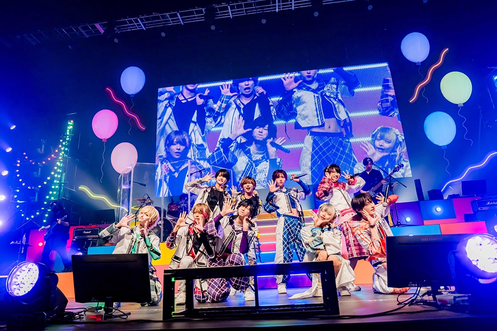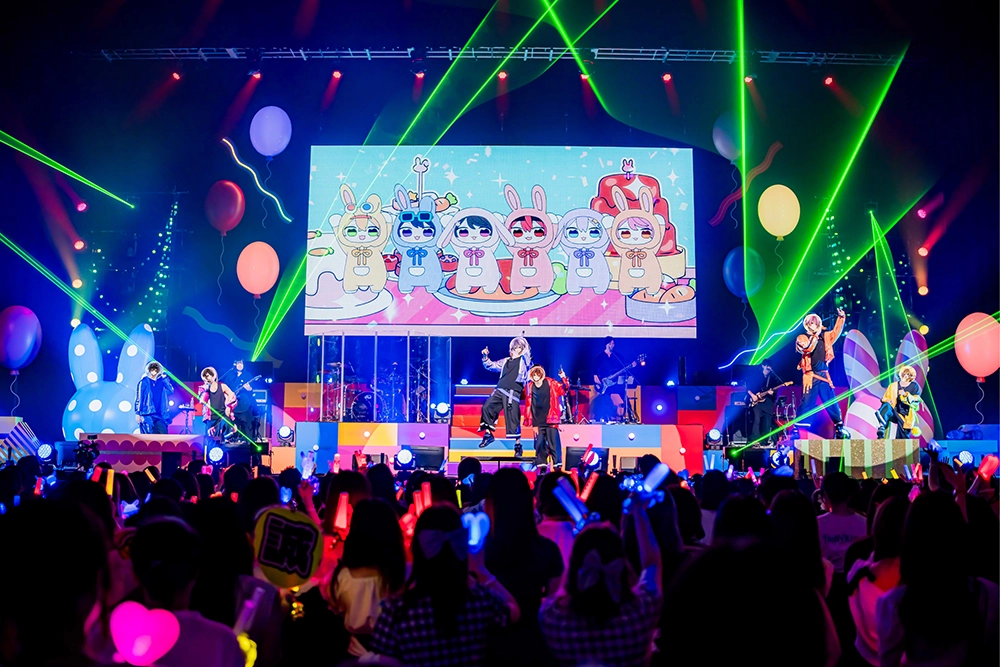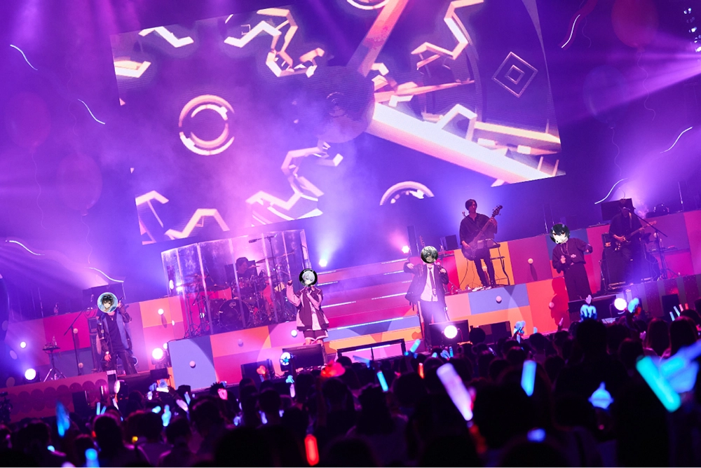 次はフェスのBブロックがスタート。Midnight6は2022年結成の歌い手グループで、都会の雑踏の音が聞こえ、パトカーの音と共に真っ赤なライトに照らされて6人が登場。初のオリジナル曲「HACHAMECHA」で、A、Bメロでラッパーのそうまがラップをキメ、サビでは観客とコーレスするシーンも。このフェスで初披露の新曲「チャレンジャー」では会場と一緒にタオルを回した。