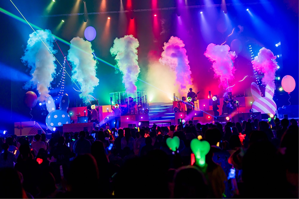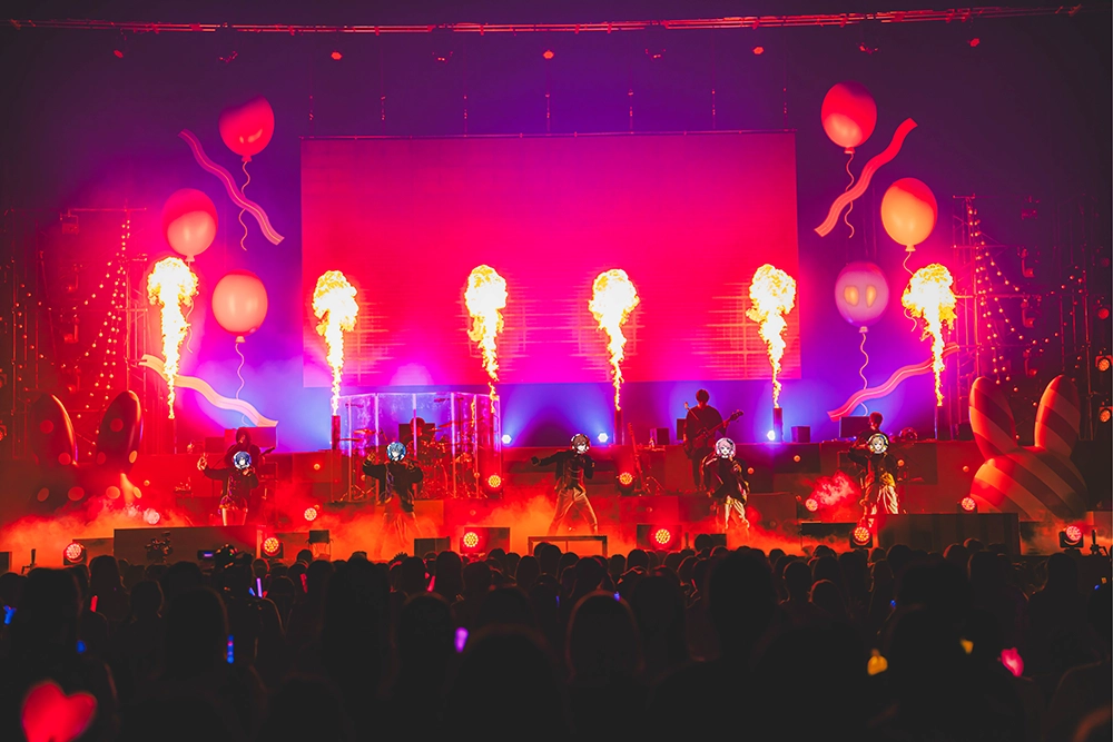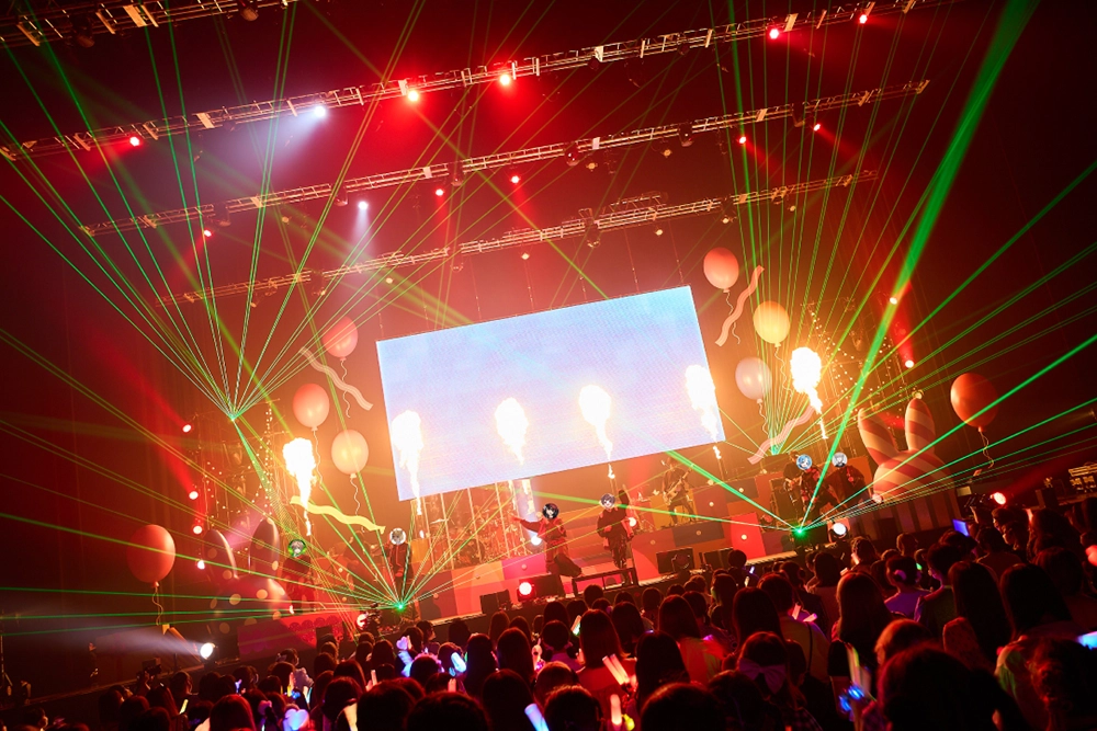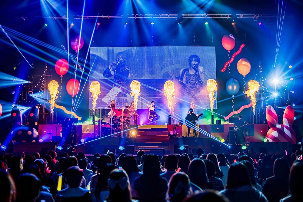 ステージにはウサギの形をしたお菓子やキャンディの風船、お立ち台はケーキなどファンシーンな雰囲気。そこにバンドセットがあるところが不思議な感じ。暗転して桜の木や茶室などの和テイストの映像から地球を飛び出し、オーバチュアの音楽も和テイスト。そして桜の模様が浮かび上がる中でNext Artistとして紹介されたのは、イベントのホストを務めるちょこらび。ステージ中段に現れると歌うのは最近ネットにアップした熱くて元気な楽曲「ラビラビ☆サマータイム」。「オオオオ」とお客さんと声を合わせ、Dメロでは後方に火柱が!