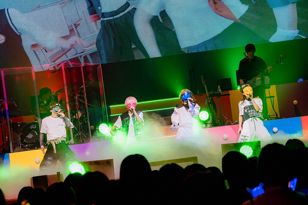 4組目のよろずやは、「マインクラフト」などゲーム配信を中心に活動中の4人組ユニット。後方からの七色のカクテルライトとスモークの中から登場。きつねなどのお面を付けた2人と素顔の2人という珍しい構成。普段はゲーム実況が主で、ライブは初めてとのことだが(3日前にポケカメンから連絡があったとか)、「ロールプレイングゲーム」と「ジャンキータウンオーケストラ」のアッパーな2曲で会場の温度を上げた。