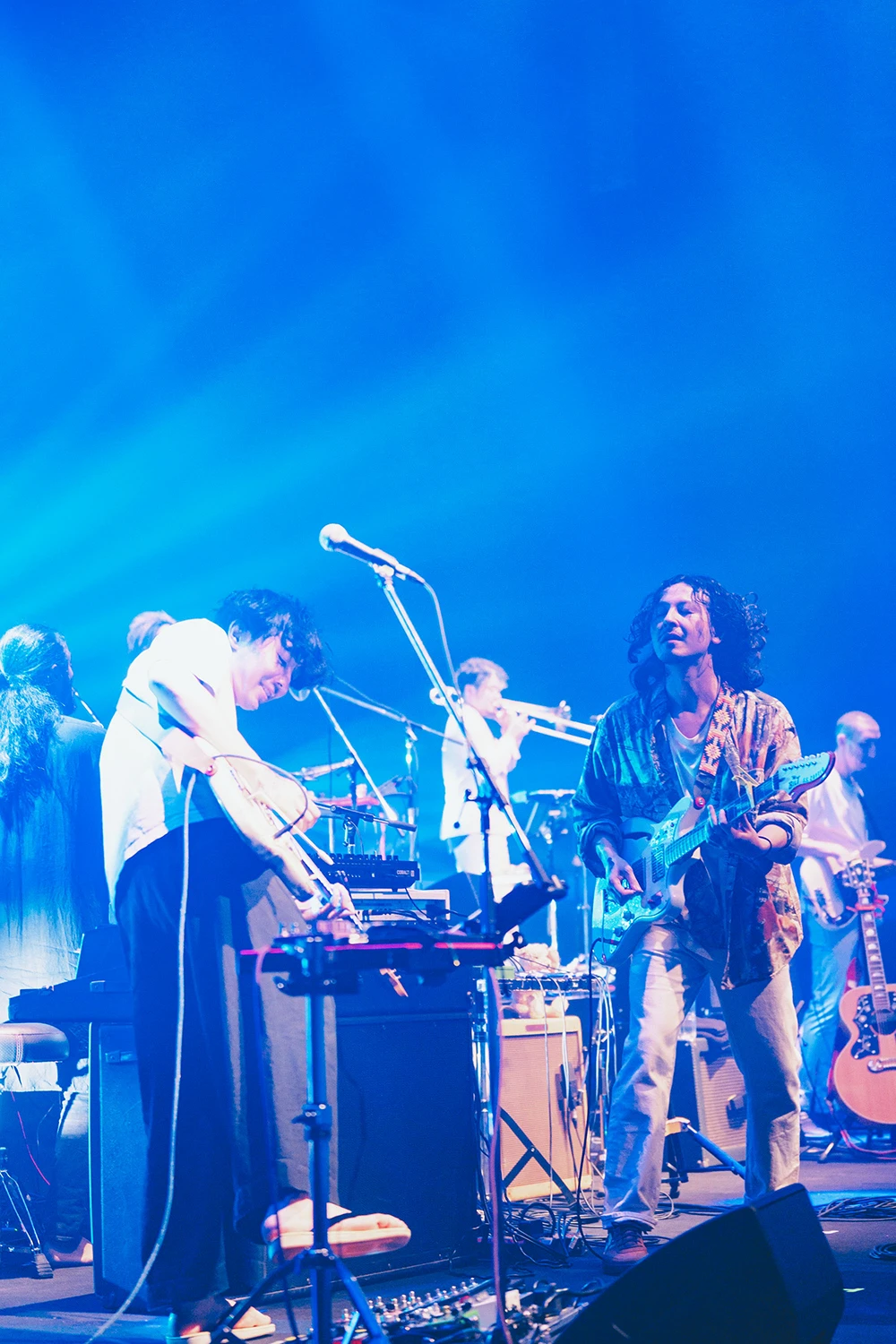 そこから、ROTH BART BARONの楽曲の中でもっともアップテンポで華やかな部類に入る「Closer」、RyuとKOTETSUもリードボーカルをとって大歓声を浴びた「赤と青」、壮大なサウンドスケープがLINE CUBE SHIBUYAを包んだ「BLUE SOULS」、この日ここまででいちばんオーディエンスを踊らせた、そして歌わせたダンス・チューン「MOON JUMPER」(三船雅也、マラカスを振りながら歌う)の4曲で、本編が終了する。