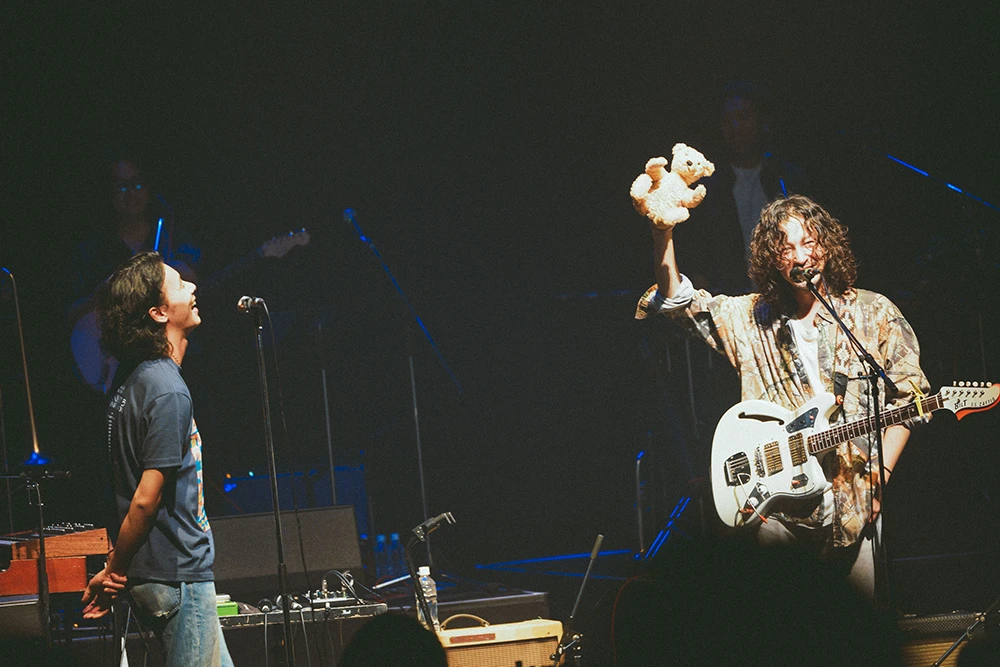 次は崎山蒼志の最新のヒット曲「燈」。この曲をROTH BART BARONが演奏するとこうなる、という新鮮さと、まるでふたりでひとりのように崎山蒼志と三船雅也の歌が溶け合うさまに、オーディエンスが魅入られているのがわかる。