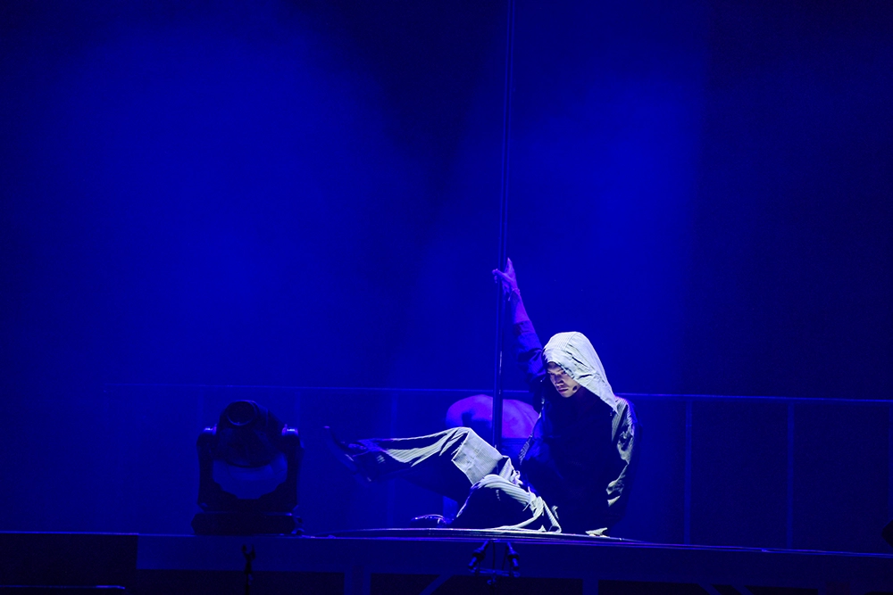鍵盤が重厚な音を奏で始めると、表情が見えない中、右手でポールを力強く握り本人にとって初めてとなるポールダンスを披露。短い時間ではあったが高い技術と多彩なトリックで観客を魅了。その後、ポールダンスは振付・ダンサーを務めるTERUPOPにバトンタッチした。