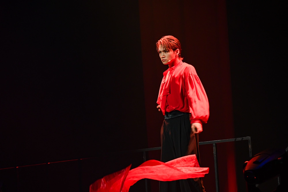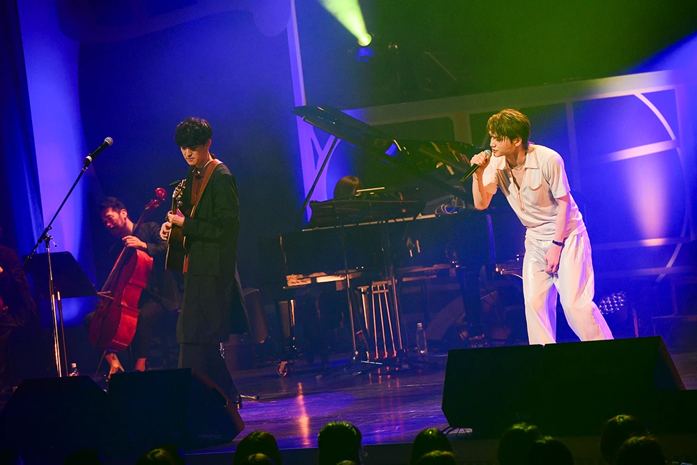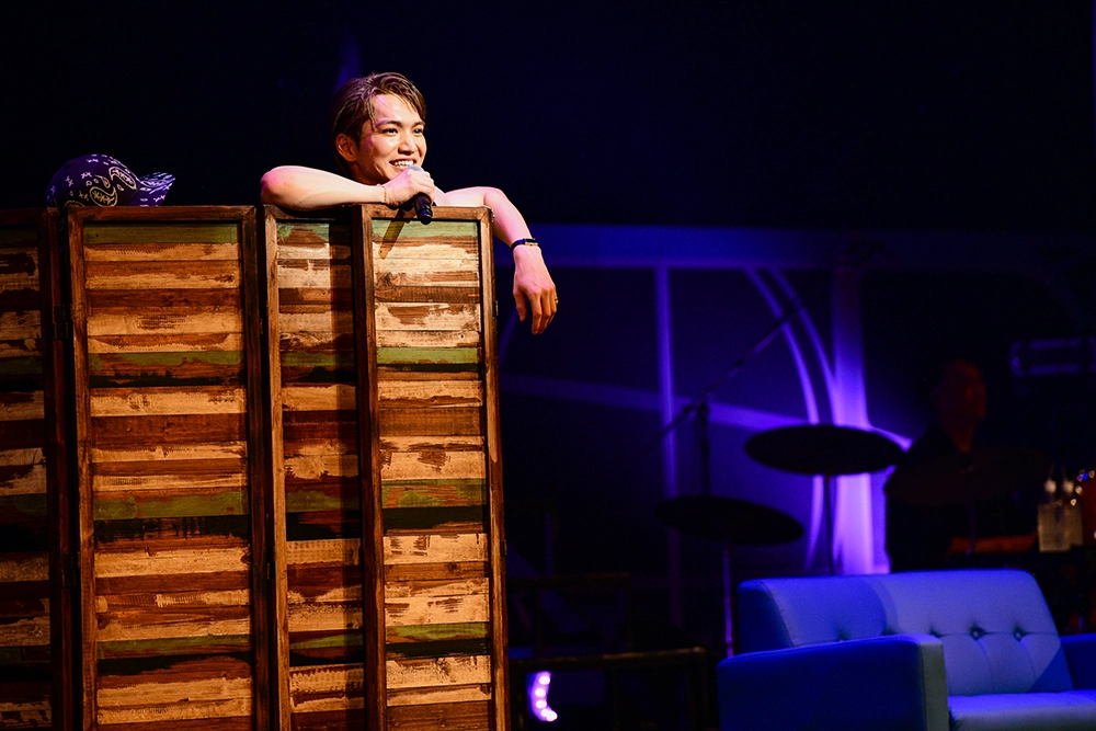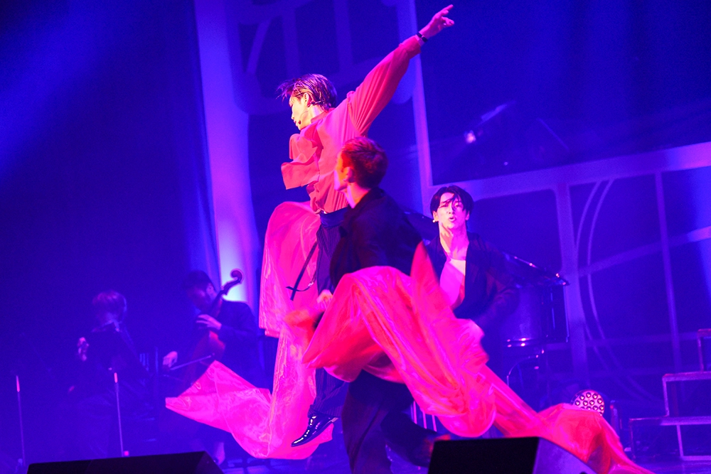 2曲目には日本だけではなく、韓国でも上演されたミュージカル『デスノート THE MUSICAL』で世界一の名探偵・Lの楽曲「The Game Begins」を伸びやかに歌唱。まとっていた黒いジャケットをサッと脱ぐと、階段を上って2階のステージへ。持っていたジャケットを一瞬でストールに変えて見せた。優雅なフリルが印象的な真っ赤なシャツで踊る姿は、軽やかなマタドールのよう。2人のダンサーを従えた三浦は、タンゴのリズムに合わせ、アクロバティックなリフトでわかせるなど、剛と柔のパフォーマンスでファンを虜にした。
