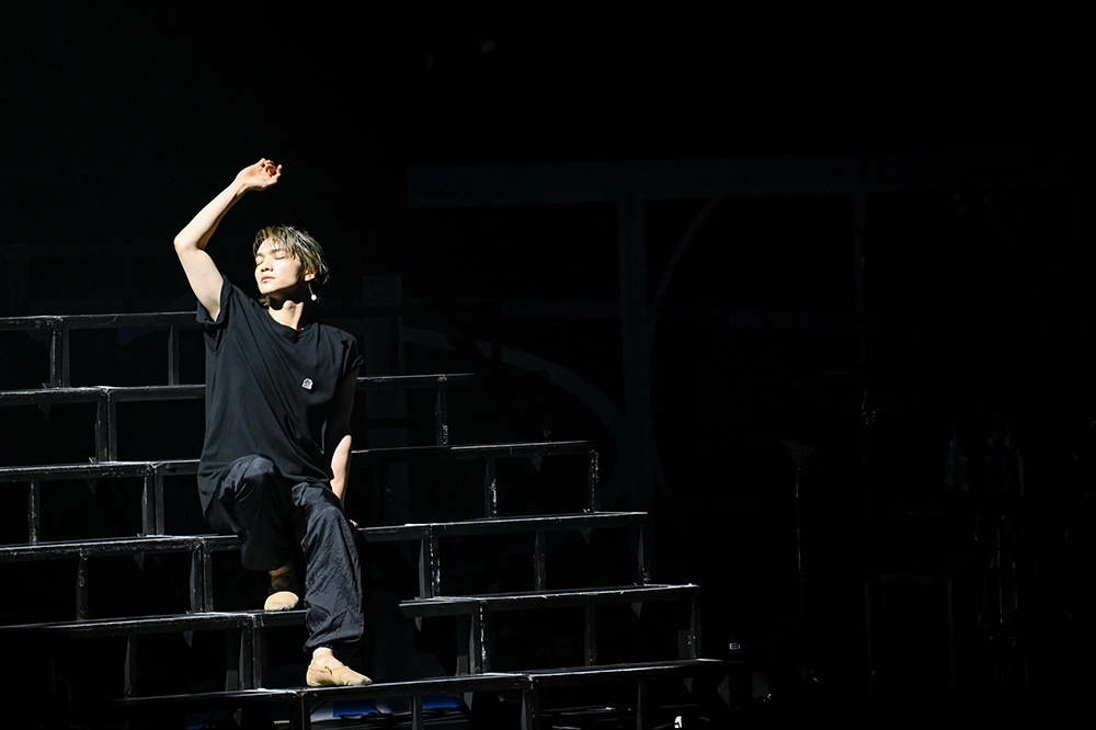 序盤から度肝を抜く演出に圧倒されていると、三浦の背後に影のようにダンサーが加わり、主演したフレンチロックミュージカル『赤と黒』の楽曲「赤と黒」が流れてきた。階段を駆け下りると、かぶっていたフードを外す。沸き起こる歓声。観客に正体を明かした三浦は、野心家で繊細な美青年、ジュリアン・ソレルとして、影を切り裂くような怒りの歌声を披露。2人のダンサーとともに流し目で妖艶な舞いを見せるなど、多彩な表現で魅了していく。