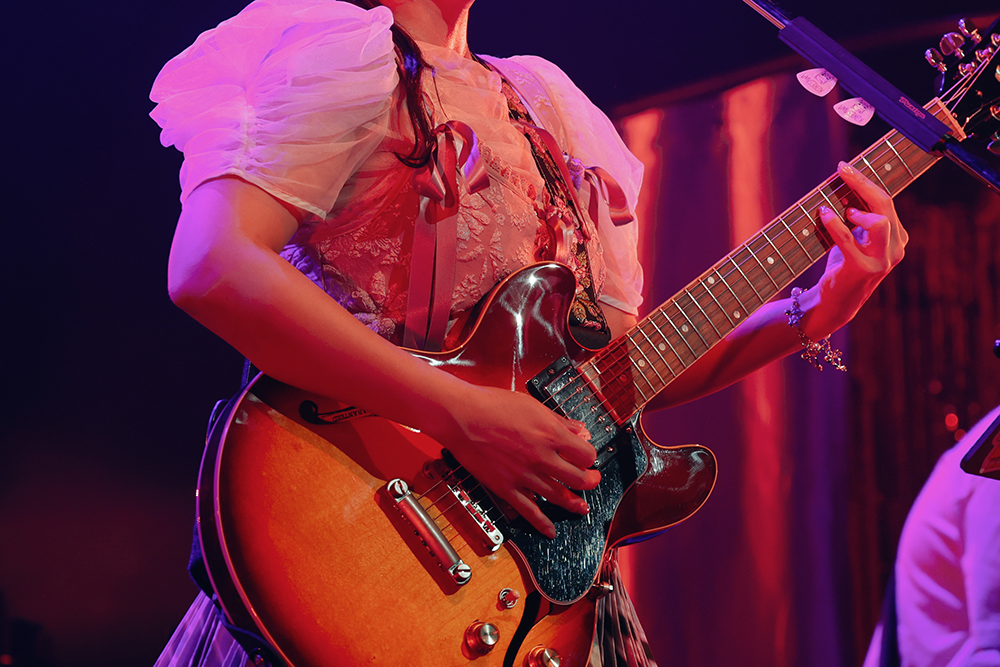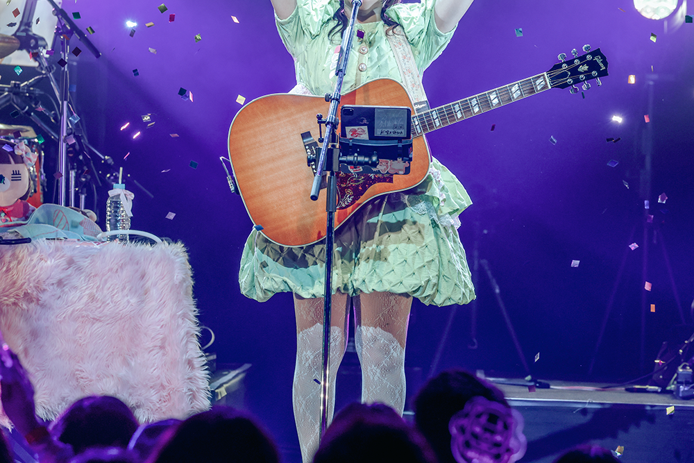 「たくさん歌ってくれてありがとうございます。うれしー」と感謝の言葉を伝えた彼女は、前回のZepp Shinjukuで初披露した新曲「元彼女のみなさまへ」で過去に出会った全ての人への感謝の気持ちを込めた晴れやかな表情をみせ、ワンピースのポケットに潜ませた紙吹雪をジャケットと同じように散りばめてみせた。そして、観客が自身のいつかの恋と重ねながら静かに耳を傾けた代表曲「たばこ」からバスドラが夏の終わりを急かす「サマーエンド」を経て、衣装をチェンジ。