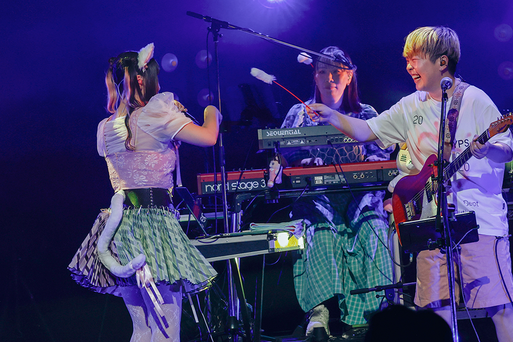 「この服、みんな可愛いって言ってくれるかな?」と呟きながら衣装を着替えたコレサワがステージ上に設置された円形の着替えボックスから<今日もコレちゃん可愛いよ>と書かれたうちわを持って姿を表すと、「デートの前の夜に」では「可愛いよ」というコールが起こり、再び、着替えボックスに入って、猫耳としっぽをつけて登場した「にゃんにゃんにゃん」ではピアノは猫じゃらしの棒でプレイ。打ち込みやシンセベースを基調にしたアーバンR&B「君のタトゥー」ではステージでクルクルと自由に回りながら豊かなグルーヴを生み出して観客の体を揺らし、心地よい一体感をもたらした。