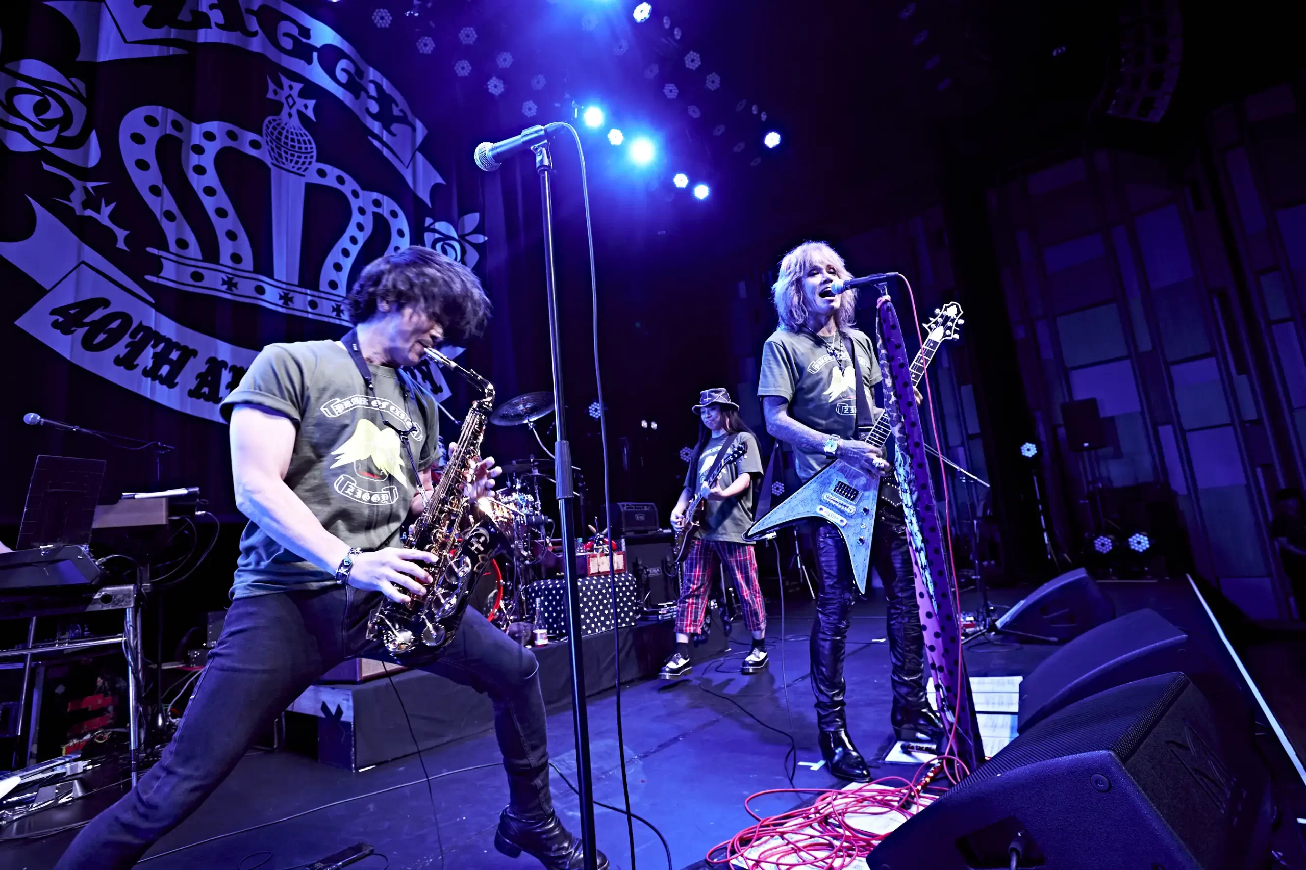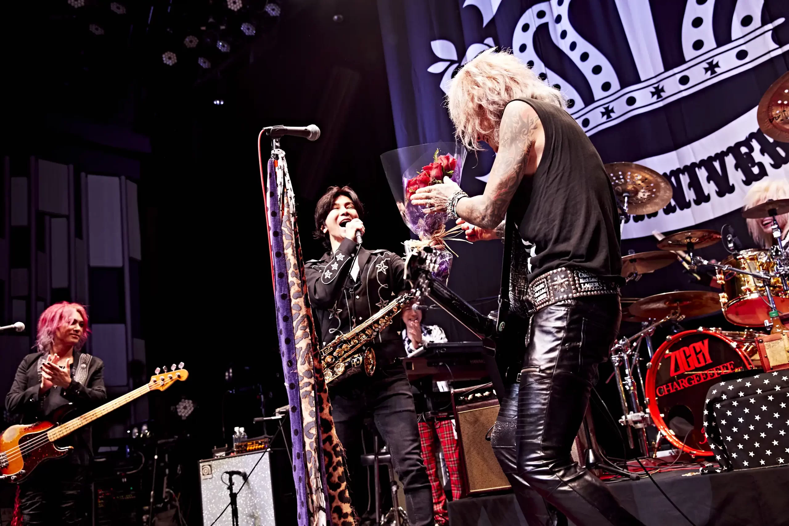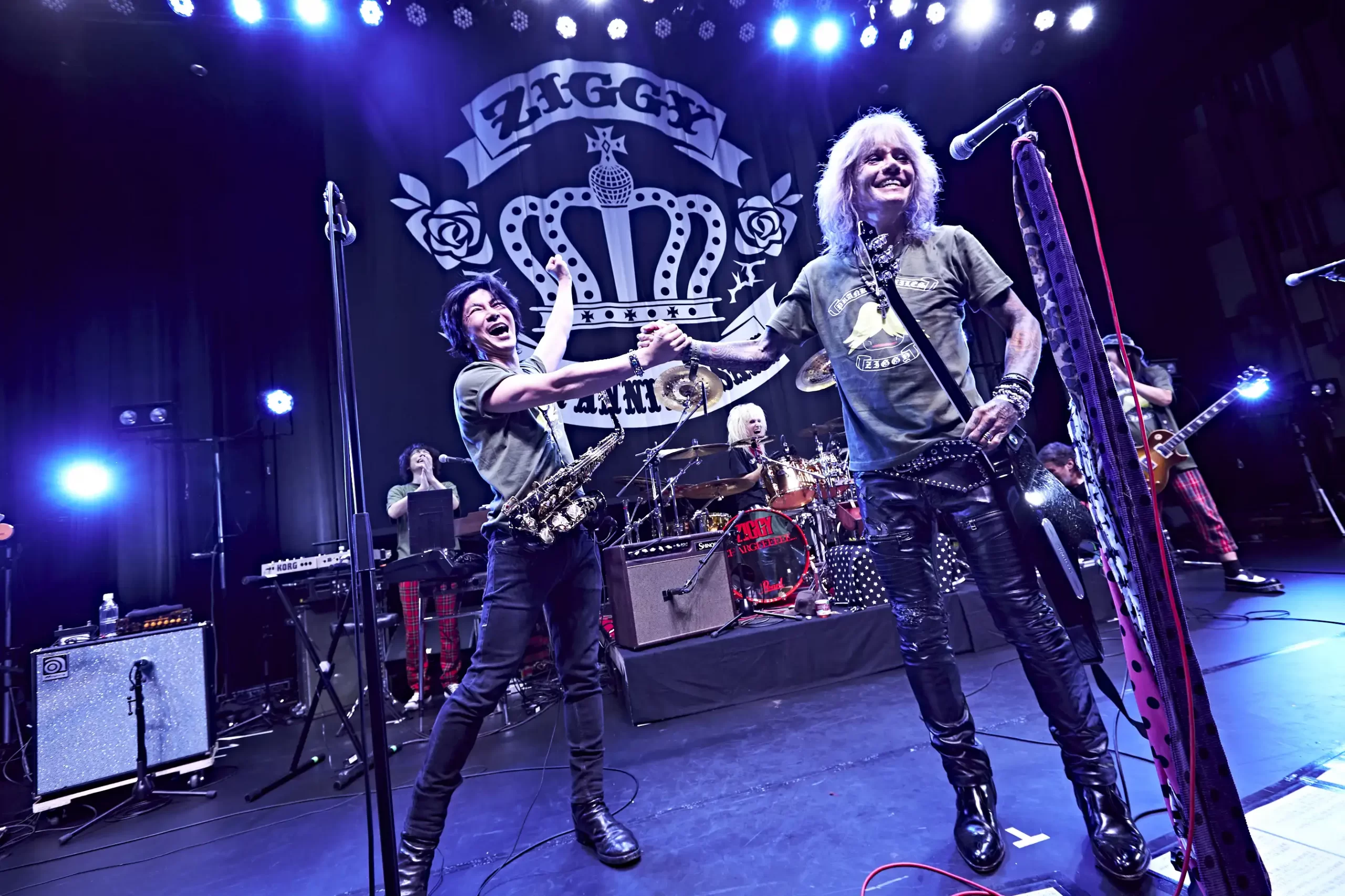 そしてフィナーレへ突入するかと思われた時、とっておきのサプライズにフロアが沸いた。「EASTSIDE WESTSIDE」を歌い終えた森重が、熱烈なZIGGYファンとして知られる俳優・武田真治を呼び込む。サックスを持ってふらりと遊びに来た武田を、森重がステージに誘ったらしい。単なるZIGGYキッズに戻った、緊張マックスの武田に温かい声援が飛ぶ。フロアが揺れるほどの声援の中、「GLORIA」の熱狂が火に油を注ぐ。学生時代にZIGGYのコピーをしていたという、武田のサックスとコーラスには情熱と愛がある。名曲はこうして、次の世代へと受け渡されてゆく。ラストソング「WONDERFUL FEELING」を歌い終えたあとも、余韻が収まらない。バンドがステージを去っても、アンコールの声が鳴りやまない。