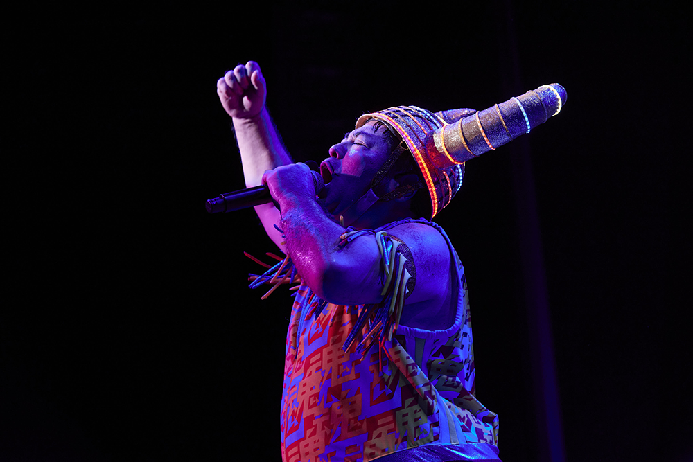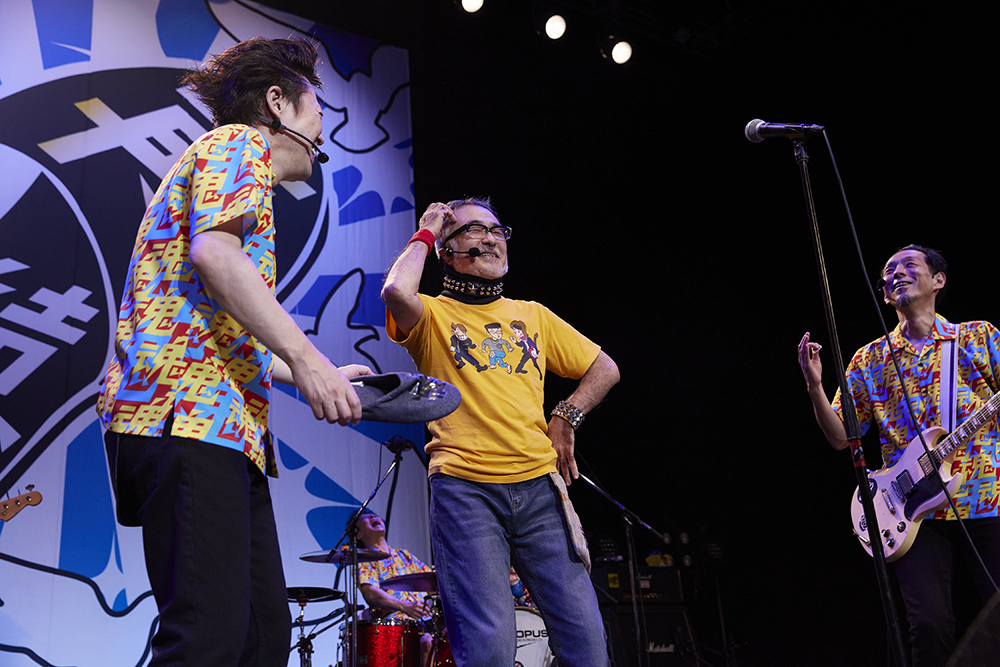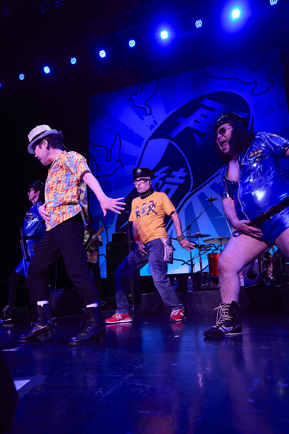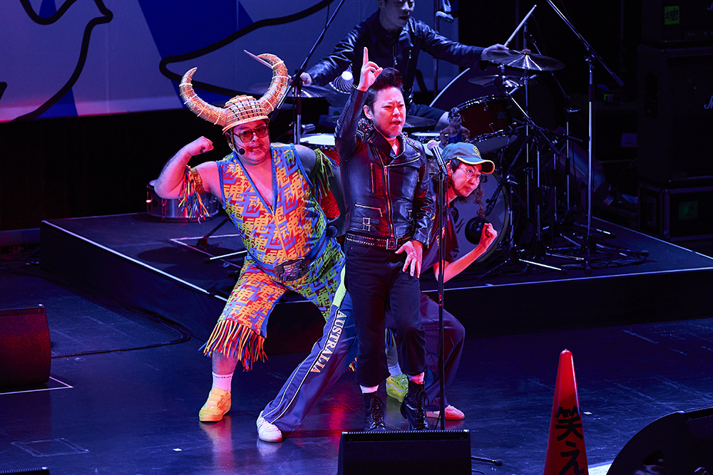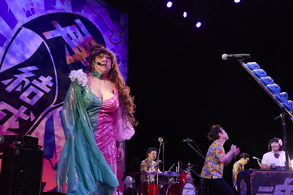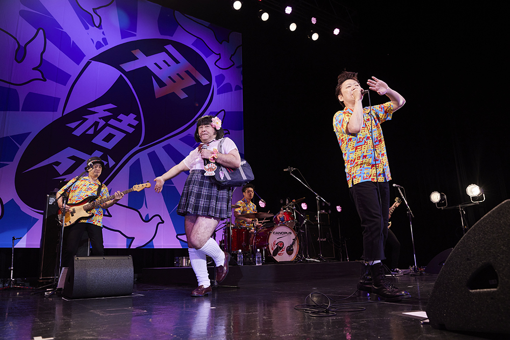 横山剣(クレイジーケンバンド)の作詞・作曲による「欧陽菲菲」、パンク×ファンクなアレンジがカッコいい「さかなクン」、代表曲「君にジュースを買ってあげる♡」を続けて演奏した後は、ライブ定番曲「職務質問」へ。ダンサーとして登場したのは、ポリス姿の宍戸、そして、見覚えのある黄色いTシャツとジーンズ姿の松尾スズキが曲の中盤に登場。大人計画の座長のダンスに、観客からはこの日いちばん大きい拍手と歓声が送られた。