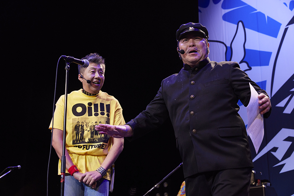 2番目のバイト応募者は、荒川良々。「どうも、闇バイト君です」という挨拶で笑いを取り、荒川も履歴書を提出。これまでの自身のバイト遍歴を紹介した後、初期の名曲「Over 30 do The 魂」へ。“Over 40 do The シコる”の大合唱のなかで、港がなぜか“Over 40ふるさと納税♪”と歌い、またしても大爆笑が起きる。