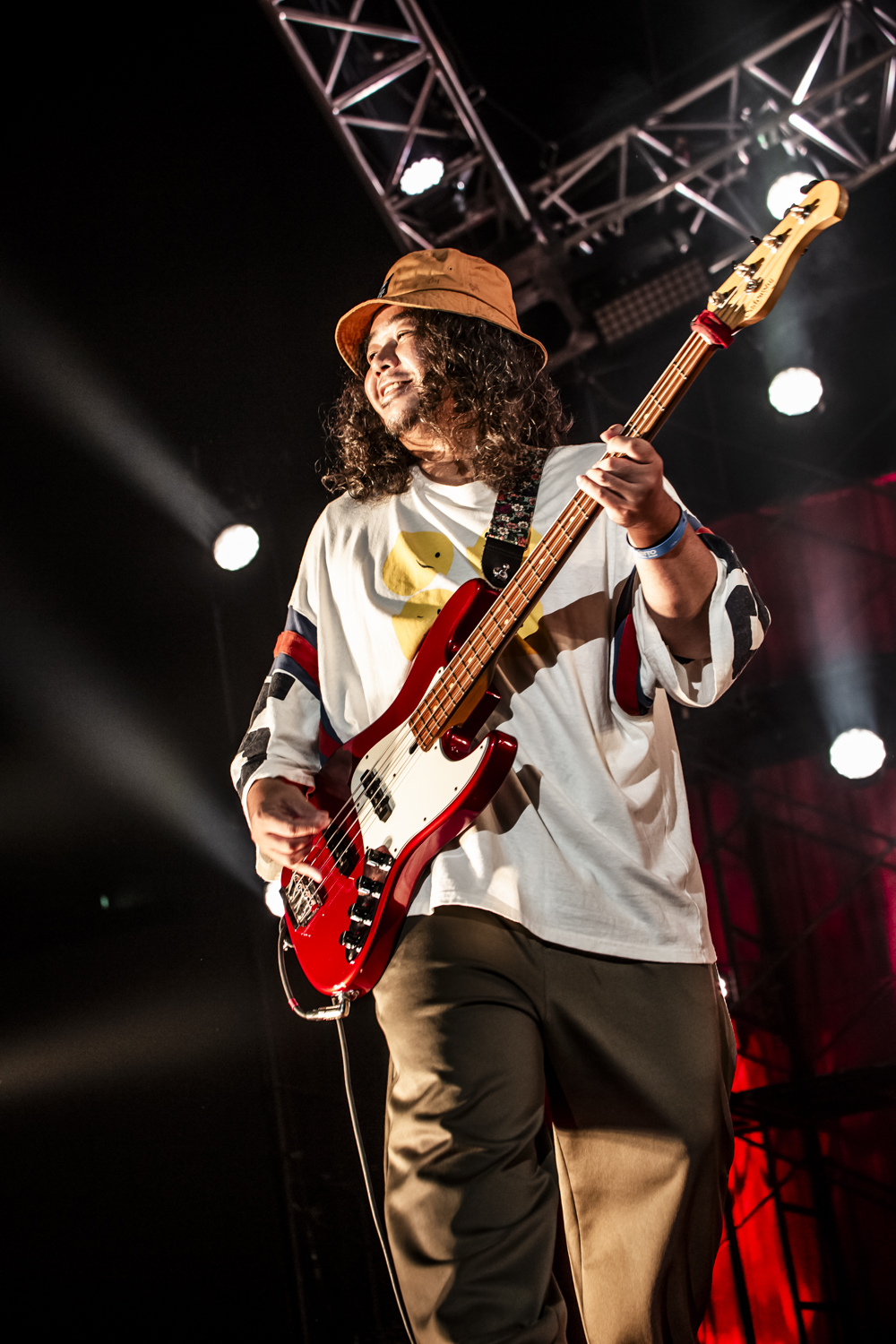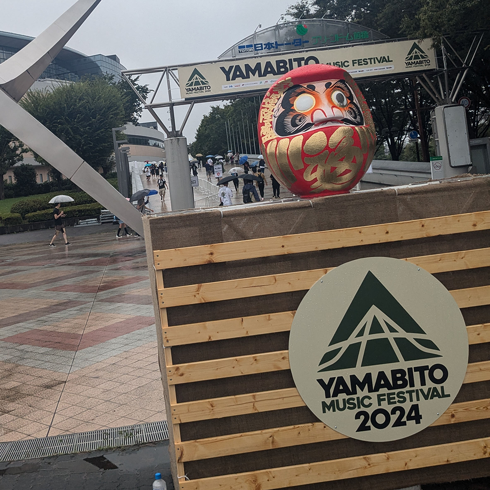 9月21日、初日。開演30分ほど前に、会場である日本トーターグリーンドームに到着。ここから始まる最高の一日に期待しながら入場口に向かうと、会場入口に飾られた巨大高崎だるまが人気フォトスポットになっていて、たくさんの人がだるまナメで、会場をバックに記念撮影していたりと、朝から楽しい雰囲気で実に良い。会場に入ると、まずはメインとなる赤城ステージが見える4階に移動して、巨大ステージにフロア、スタンドと会場の全景を眺める。「今年も『山人音楽祭』に来たんだなぁ」と思うと喜びがこみ上げ、テンションがグッと上がる。
