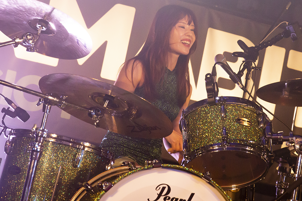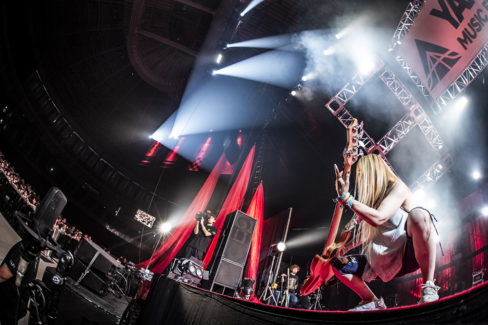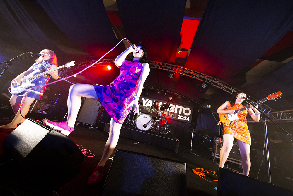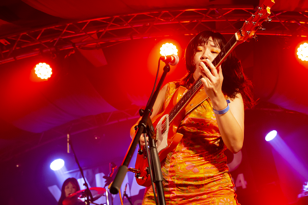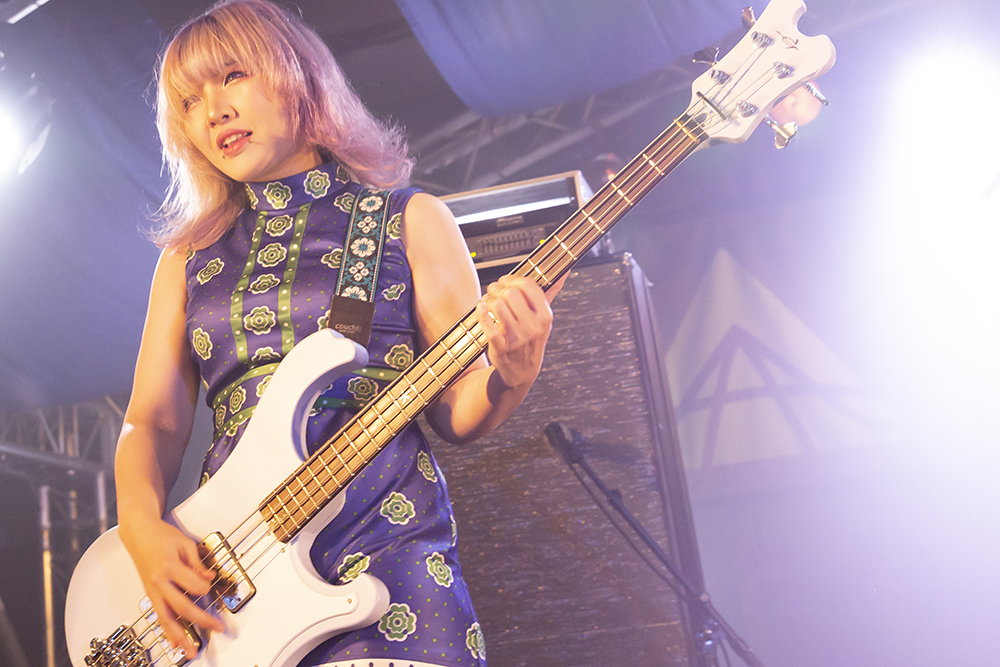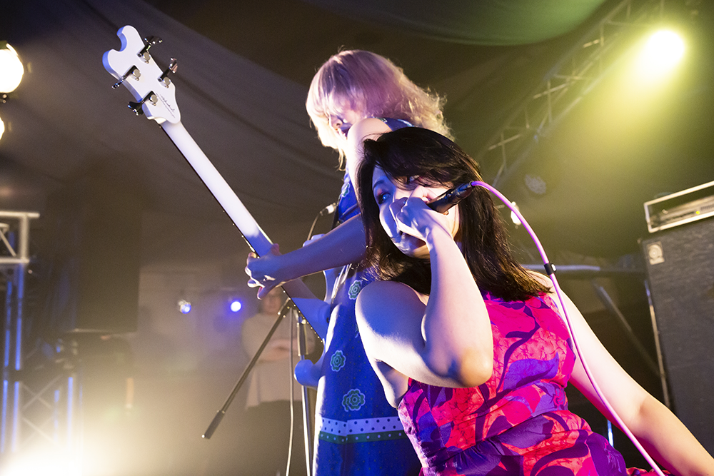 会場をひと回りしたところで榛名ステージに移動して、おとぼけビ~バ~を観戦。海外のアーティストから高く評価され、今年イギリスの『グラストンベリー・フェスティバル』の大舞台にも出演している彼女ら。もちろん音源は聴いてるし、お噂はかねがねといった感じだが、ライブを観るのは初めて。よよしえ(Gt)が「Are You Ready!?」と叫び、「ヤキトリ」で始まった、彼女らのライブ。キュートにポップに激しくノイジーに、チャカポコしたビートがドガドガと激しいブラストビートに急変したり、直情的な爆音と痛烈なシャウトで圧倒したりと、矢継ぎ早に披露される楽曲たちは、変幻自在に姿かたちを変えながらむき出しの感情でオーディエンスの心をぶっ刺す。強烈なエネルギーを放つ、あっこりんりん(Vo)のボーカルとパフォーマンスも衝撃的だった彼女らのステージ。30分という短い時間ながら、やりもやったり全15曲!ラスト「あなたわたし抱いたあとよめのめし」で駆け抜けた後、その余韻や残響にオーディエンスが呆然としてたのが印象的だった。