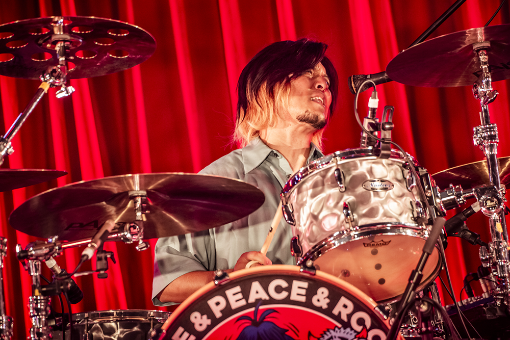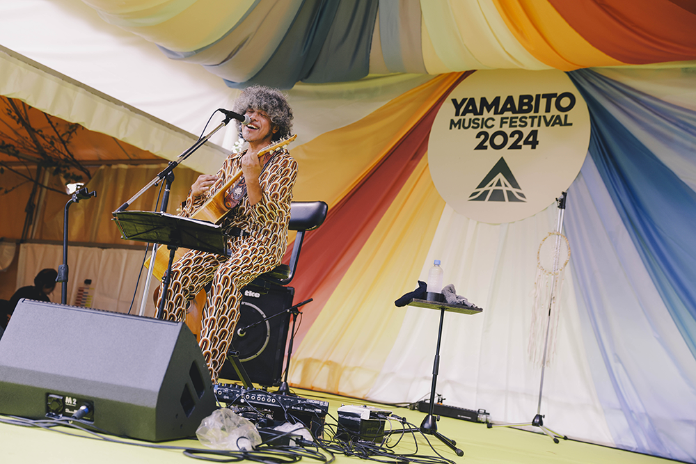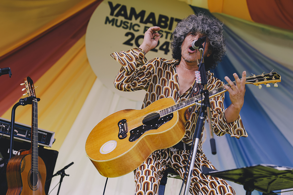 妙義ステージに到着すると、「佐藤タイジです。今年、THEATRE BROOK30周年なんですよ!」というあまりに軽妙な挨拶に、「知ってますよ!」と思わずツッコミたくなるほど近しい距離感で始まった、佐藤タイジのライブ。奥さまとの会話から生まれたという、THEATRE BROOKの新曲「私をアムスに連れていって」でスタートすると、色気ある圧倒的な歌声と巧みなアコギの演奏でオーディエンスの心をガッツリ掴み、「名作やろ?メロディ忘れないやろ!?」と自画自賛。この緊張と緩和もたまらない!続いて巧みな話術から、THEATRE BROOKの「白クマとボノボ」を披露。……正直に告白すると、このタイミングで我慢出来なくなってビールを購入していた俺。穏やかな気候の下、ビール片手に最高の音楽を浴びる至福の時間に笑顔が止まらない。ここで自身が主催する『中津川 THE SOLAR BUDOKAN』の話題に触れ、「これからの子どもたちのためにも、俺の人生は日本の再生エネルギーを100%にすることにかける。それを音楽で果たす」と、自身に託した使命を熱く語った佐藤。「ありったけの愛」を気持ちいっぱいに歌って世界に愛を届ける佐藤に、その言葉の本気さとミュージシャンの矜持を感じた。