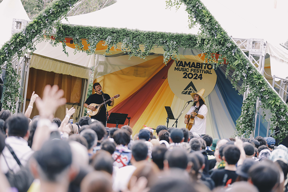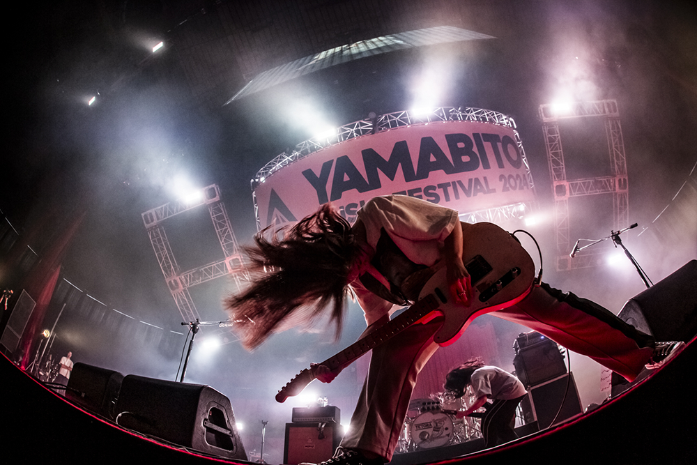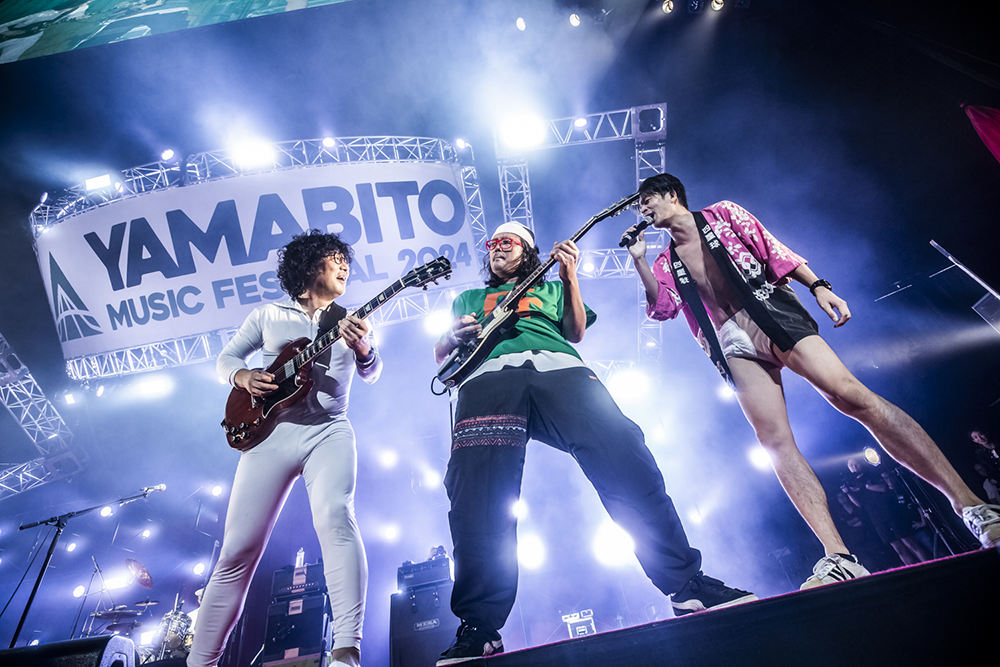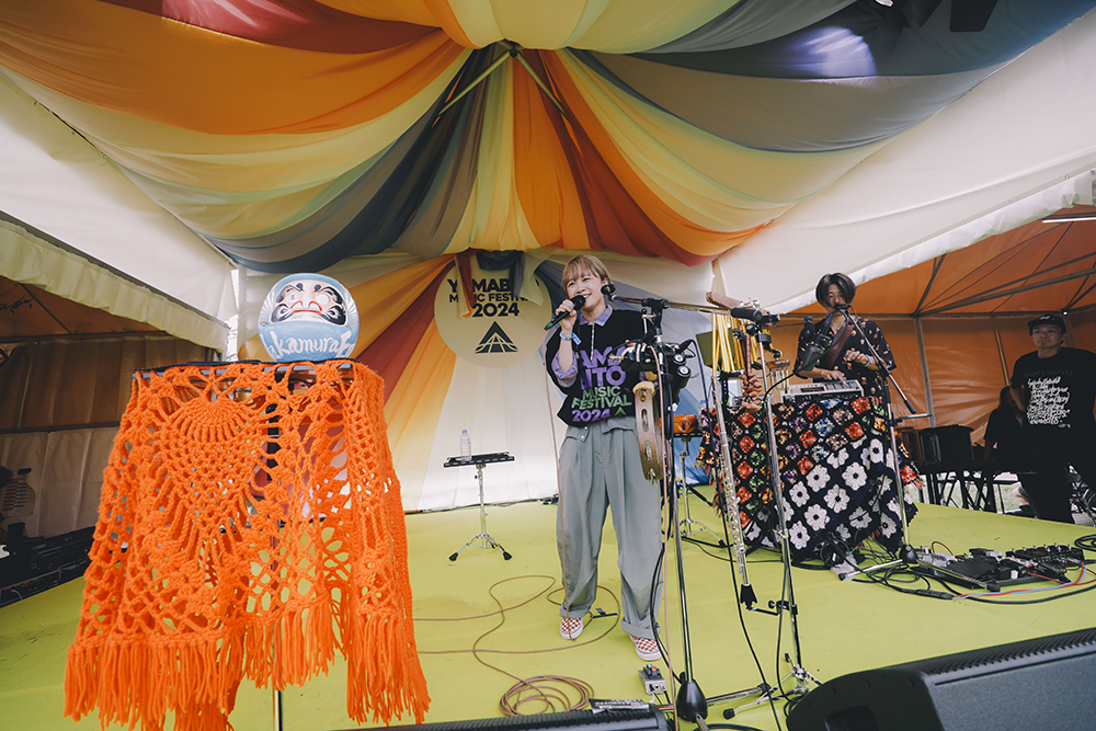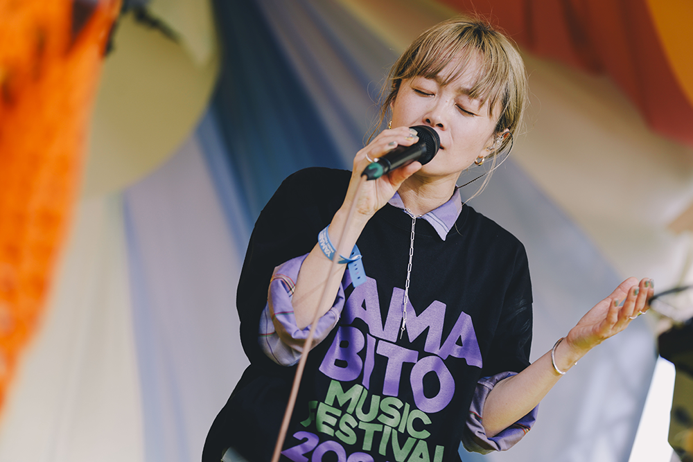 「山人、戻って来ました!」と19年以来となる出演の喜びを告げ、明るい笑顔で始まったNakamuraEmiのステージ。1曲目「Don't」でライブをスタートすると、軽快なビートに乗せたキュートで芯のある歌声と心地よく流れるフロウに、フィールドも笑顔が溢れる。「今日は雨が降ると思ってたんで選んできました」と始まった「雨のように泣いてやれ」から「スケボーマン」と続き、美しく感情豊かな歌声でオーディエンスを魅了した彼女。「『山人音楽祭』の温かいお客さんに育ててもらって、フェスが改めて好きになりました。また成長して帰って来れるように頑張ります!」と話し、YAMABITOならぬ「YAMABIKO」が始まる。彼女のリードに会場中が歌声を合わせ、心が通じ合った瞬間を見届けたところで妙義ステージを後にする。