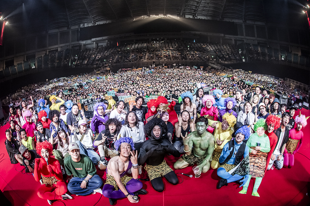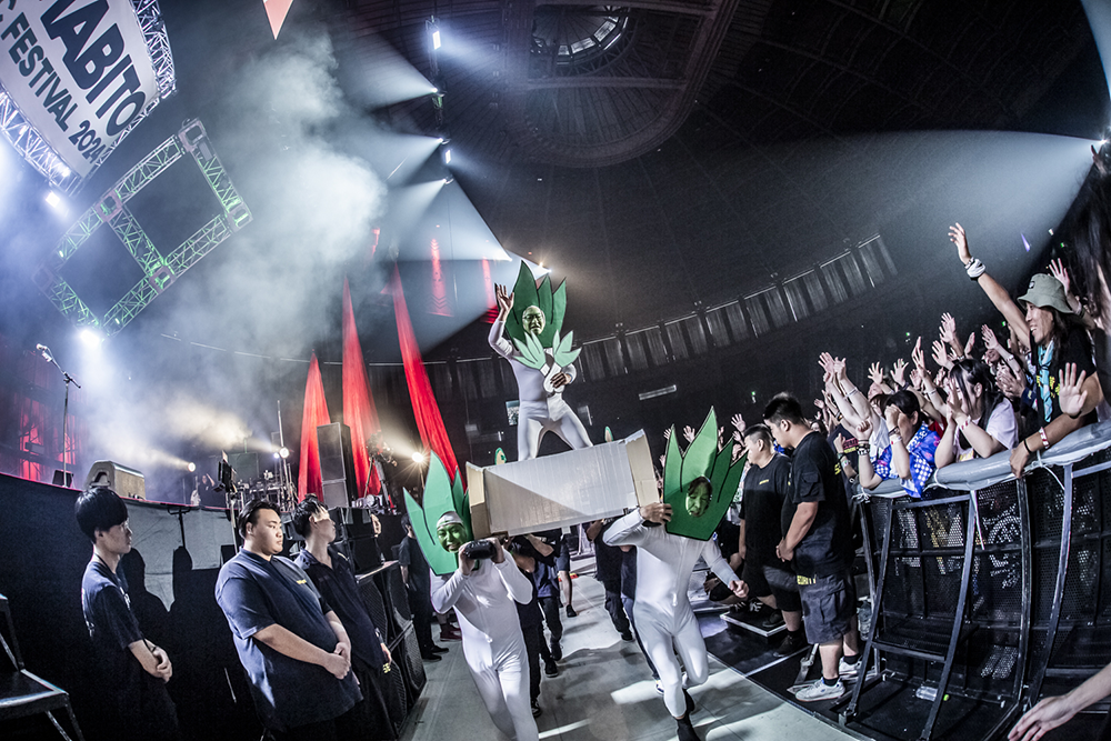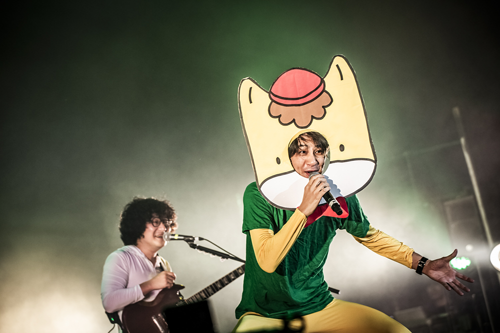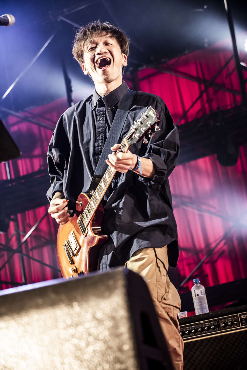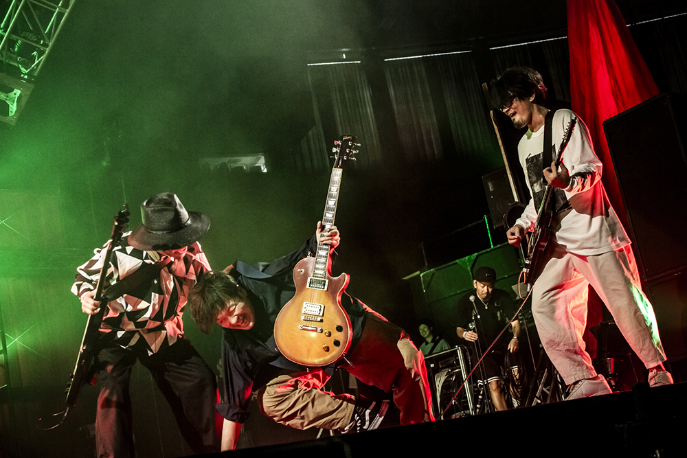 TETORAのライブを見て胸アツになってるところに、「この時間は群馬の名産、下仁田ネギの収穫祭です!」と北島康雄(シンガー)のバカバカしい説明が始まって、肩の力を抜いてくれたのは四星球。下仁田ネギのお神輿に乗った下仁田ネギ姿のまさやん(Gt)が、わっしょいわっしょいと登場して会場を沸かすと、ステージに下仁田ネギ姿のメンバーが登場し、「ふざけてナイト」でライブがスタート。ホントにふざけてんなぁ!(笑)「運動会やりたい」のスクワット対決で会場中にスクワットをさせたりと、やりたい放題の彼ら。「ちょんまげマン」ではこの夏、『ザ・ローカルズ』ツアーで共に地方を回った、G-FREAKの原田季征(Gt)が、ちょんまげ原田に扮して登場し、まさやんとの貴重なツインギターで沸かす。そして、ここでは写真での紹介のみだったが、茂木扮する“どんだけマン”が存在することも発覚。まさかその後、すぐにどんだけマンに会うことが出来るとは思ってなかったけど……。ラスト「コミックバンド」ではザ・ドリフターズへの敬意や高木ブーに会えなかった無念を告げ、笑いの素晴らしさをしっかり届けてフィニッシュ。愛と笑いとリスペクトに溢れた、本当に楽しいステージだった。