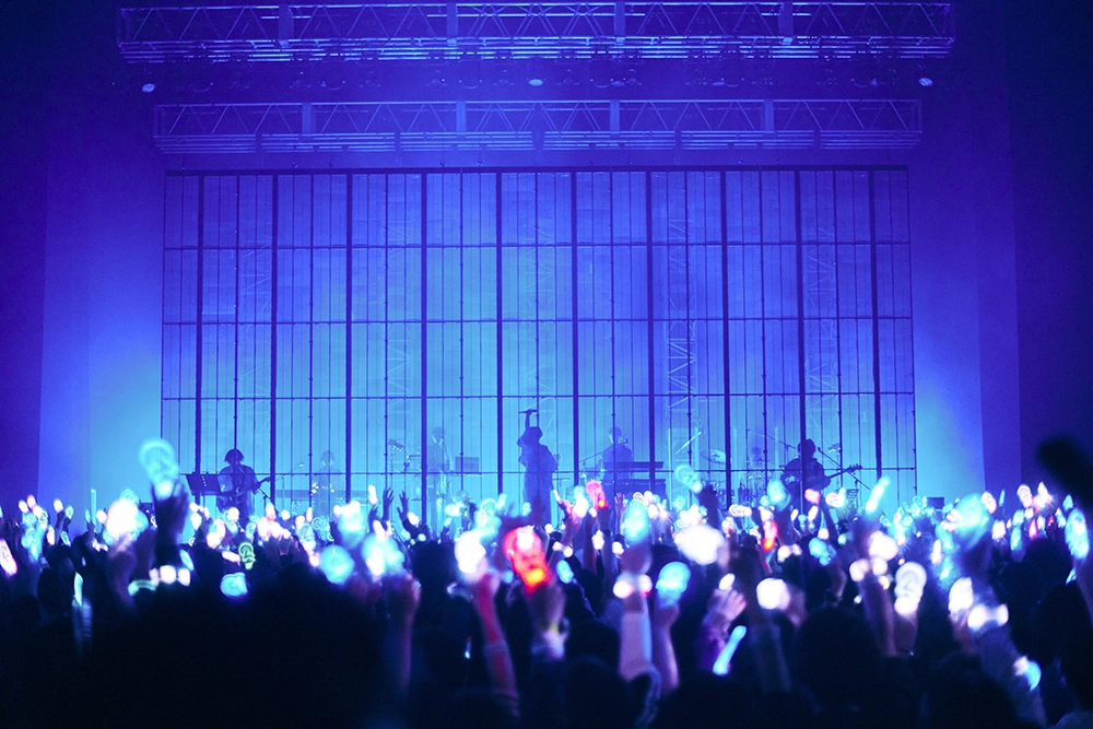 開演前、ステージ前方に設置されたLEDモニターの両脇にQRコードが映し出されていた。それをスマートフォンで読み込むと、ステージのモニター上に自分が指定した色と形の光をスワイプで投げ入れられるサイトにアクセスできた。ステージは観客の放つありとあらゆる光で絶えず華やぐ。その光景は、ふたりの居場所を観客があたためているようにも見えた。