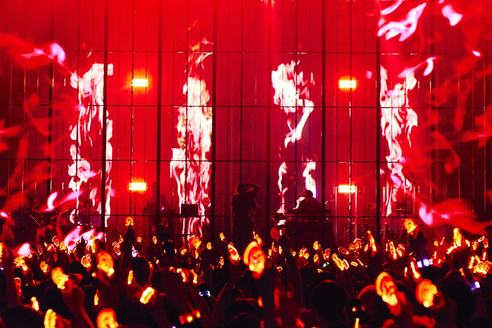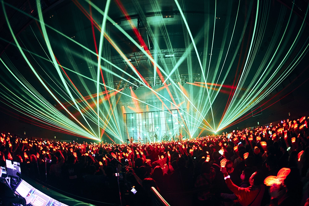 定刻で暗転し、先ほどまで光が舞っていたモニターにオープニングムービーが流れる。その映像が消えると、モニター越しにDUSTCELLがサポートメンバーとともに姿を現した。1曲目「GAUZE」からバンドとともにドラマチックかつエモーショナルな歌と演奏を届け、「火焔」ではMisumiもフロアを煽り、観客もそれに応えるようにクラップやコールで熱量高くレスポンスをする。鮮烈で迫力のある映像演出も相まって、炎の熱がこちらに襲い掛かってくるような錯覚に陥った。