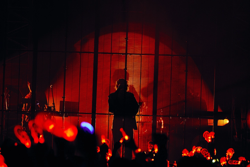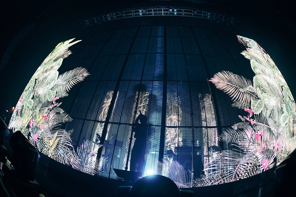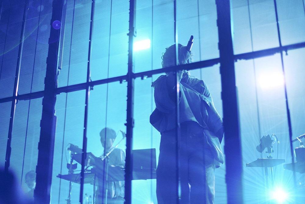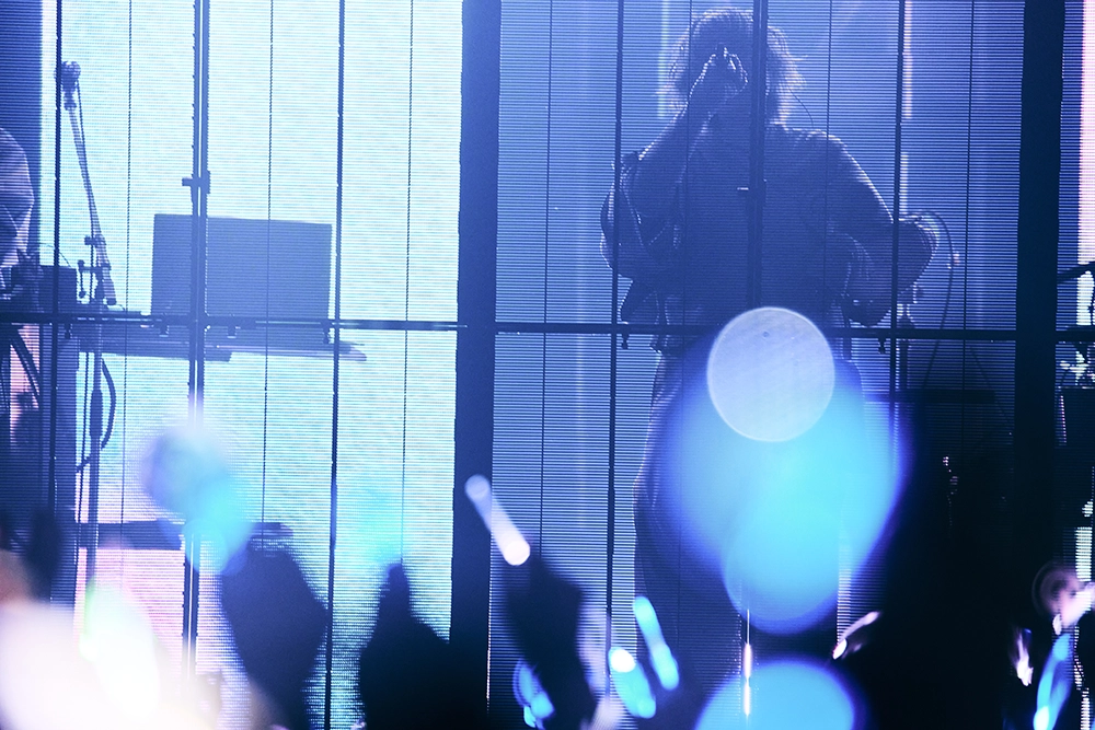 ステージ背面には縦長で4本のLEDモニターがそびえ立ち、光を体現する演出が施される。LEDモニターは透過型のため、映像が消えるシーンや背景が透過の際はステージを覆った壮大なステージセットにも成り代わった。金属の隔たり越しに見る、音に身を任せるように衝動的に身体を振り動かしながら切迫感と優美さを併せ持った歌を響かせるEMAの姿は、どこか危うくも美しい。視覚と聴覚を刺激するステージが、会場全体をDUSTCELLの内部へと取り込んでいく。