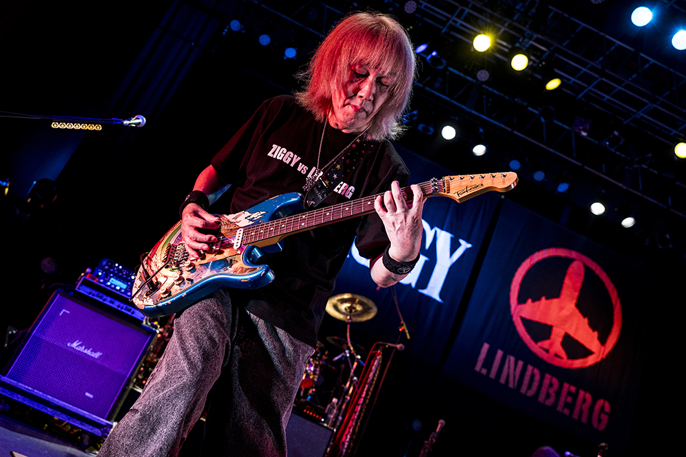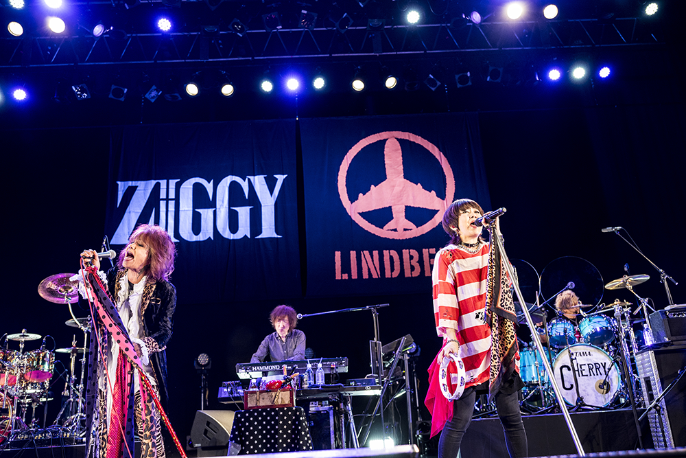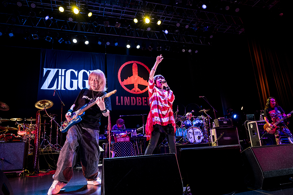 「GAMBAらなくちゃね」のCherryのドラムの激しさとしなやかさに目を見張る。「恋をしようよYeah!Yeah!」の平川のギターソロにしびれる。堅実とハッチャケの塩梅が絶妙な、実にバンドらしいバンドサウンド。そんな宴もたけなわ、渡瀬マキが森重樹一の名を呼ぶと、今日イチの拍手と歓声が湧き起こった。二つのバンドだけで同じステージに立つのは、デビュー間もないLINDBERGが当時の事務所の先輩・ZIGGYのオープニングアクトを務めて以来、35年振りだ。