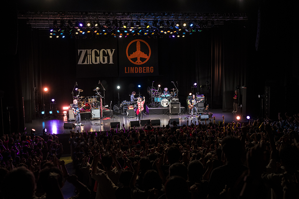 30年以上にわたって同じ時代を生き、深い縁で結ばれながらもなぜか共演機会がほとんどなかった二組が、今夜ついに相まみえる。ZIGGY vs LINDBERG「今すぐGLORIA」。“vs”となっているが、チケット完売の客席に対決ムードはまるでない。ピースフルな空間に、今日限りのグッズのバンTとマフラータオルと笑顔が溢れてる。オープニングアクトのSAHAJi(Cherryとdarling、Toshiが飛び入り!)が、気迫のこもったプレーで盛り上げる。舞台は整った。Ready to go!