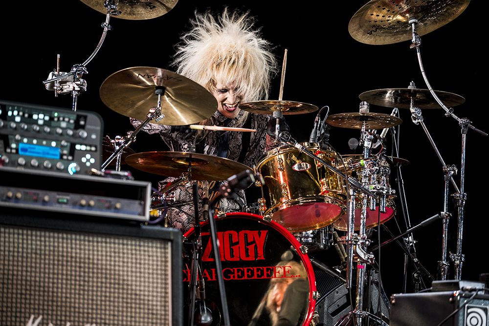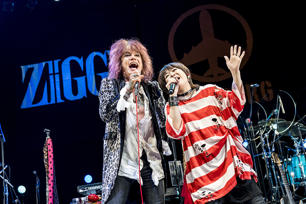 さぁ、ならず者たちの登場だ。CHARGEEEEEE...、Toshi、カトウタロウ、さっきよりメイクが濃い佐藤達哉、そして森重樹一がステージに揃うだけで危険な魅力が溢れ出す。「Guilty Vanity」「蒼ざめた夜」「HOW」と、あまりライブでやらない曲を冒頭からぶちかましたのも斬新だ。森重がマイクスタンドを高々と掲げる。CHARGEEEEEE...が2曲目で早くもスティックを折る。メンバー全員、気合の入り方がとんでもない。さっきまでフロアはLINDBERGファンの声援が多いように見えたが、今は手振りや掛け声で盛り上がるZIGGYファンでいっぱいだ。結局、みんなどっちも好きだということか。