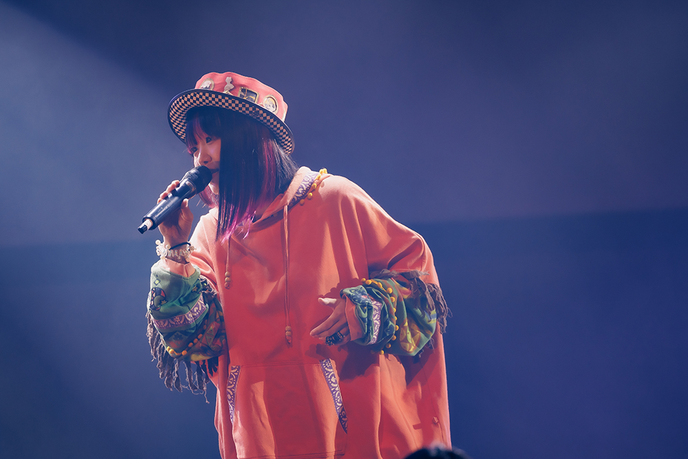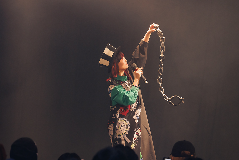 アウトロが開けると元気に「サンキュ!」。チャイムの音が鳴ると、「みんなの声を聴かせてください! 一緒に盛り上がっていけますか?」の問いかけに、会場も「オー!」と反応。それを確認すると「いっくよ~!」と「死ンデルラ」へ。ハツラツとした声で歌うが内容は「もしも、シンデレラにストーカーがいたら?」というギャップのある物語(本人作詞)。1Aの「はい、どうぞ。」やサビの「バビディブー! ビビディバディ!」のパートではみんな声を合わせ、すっかりファンとのチームワークが出来上がっている。