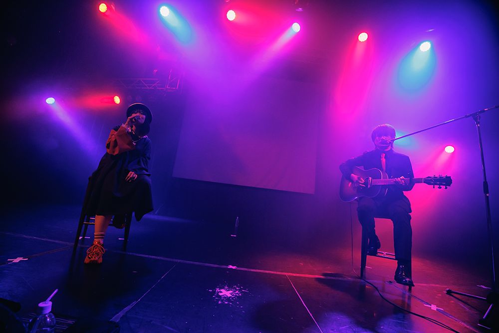 楽曲が終わると同じ事務所の盟友、とくみくすとのMVのメイキングや楽曲の映像が流れる。映像が終わり、1組目のゲストのとくみくすがアコギを抱えてステージに現れてギターを弾き始めると、なすお☆も後から登場し、とくみくすと「ヴィラン」をデュエットで。ボーカルの高音と低音が美しいハーモニーを奏でながらサビでは情熱的に。歌い終わると、「ギターソロの時、みんなに「かわいいよ」とか「イケメン」と言われて、ニヤけてたよね?」となすお☆に突っ込まれ、「だって、嬉しい」と喜びを隠さない。なお二人が出会って7年、二人でライブをやるのは2019年の無料ワンマンツアーを一緒にまわって以来、5年ぶりとのこと。そこで久しぶりにどんな曲でも弾くという即興リクエストコーナーを開催。フレデリックの「オドループ」やなすお☆の「死ンデルラ」のアコギver.など華麗な弾き語りを見せて大きな拍手を受けた。そしてとくみくすがなすお☆の曲の中で一番好きだという「忘れ物」でもコラボ。愛し合い、一緒に暮らした彼が明日、ふたりで過ごした家を出ていく。ふたりがさよならする前日の夜の気持ちを歌った曲で、アコギの優しい音色となすお☆のせつない歌声、とくみくすのコーラスが入ることで、より胸に刺さる。