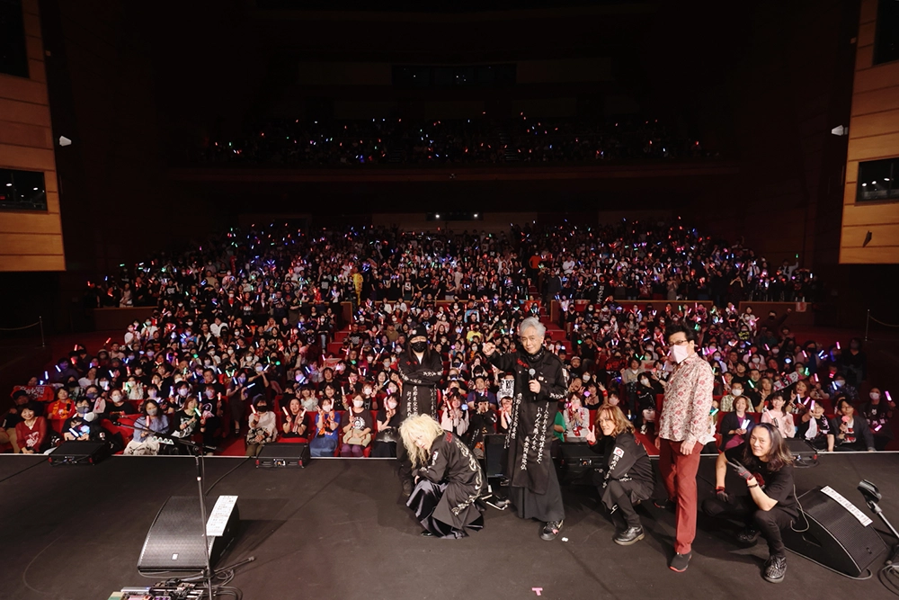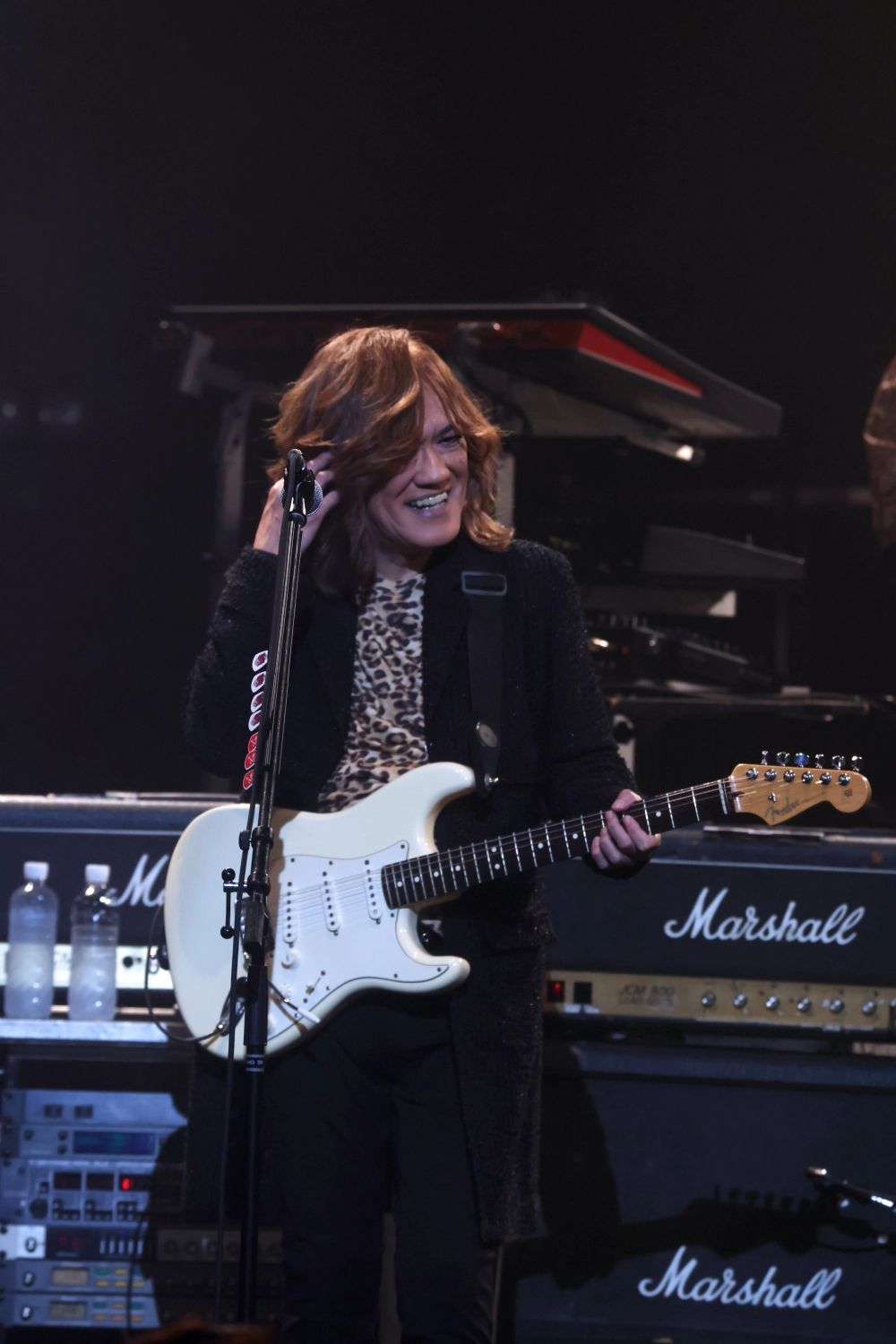 すると、MCを遮るようにベースを鳴らす内田雄一郎(Ba)に「ベースを弾きたいのか!? じゃあ、やってもらおうじゃないか!」というオーケンが挑発。内田の鳴らすノイジーなベースで、なだれ込むように「ゴーゴー蟲娘」が始まる。しっかりリズムキープする本城聡章(Gt)のギターに乗せて、橘高文彦(Gt)が軽快にタンバリンを鳴らしたり、内田がペンライトで叩き弾きしたりと、自由に楽しく演奏するメンバー。ギターを背負った橘高が麗しのギターソロで魅了して、ドジャーンと演奏を終えると大きな拍手と歓声が起きる。