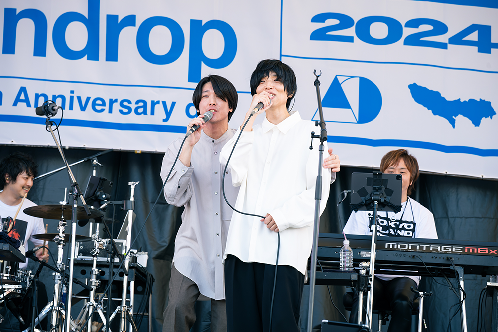 そして、drop STAGEの三番手として、androp、この日一度目の出演。「androp ISLAND Session」というタイトルで、全5曲すべてがゲストとのコラボである。UNISON SQUARE GARDEN斎藤宏介、Ourin-王林-、元yonawoの荒谷翔大、菊池桃子、SHE’S井上竜馬が、内澤崇仁とデュエット。