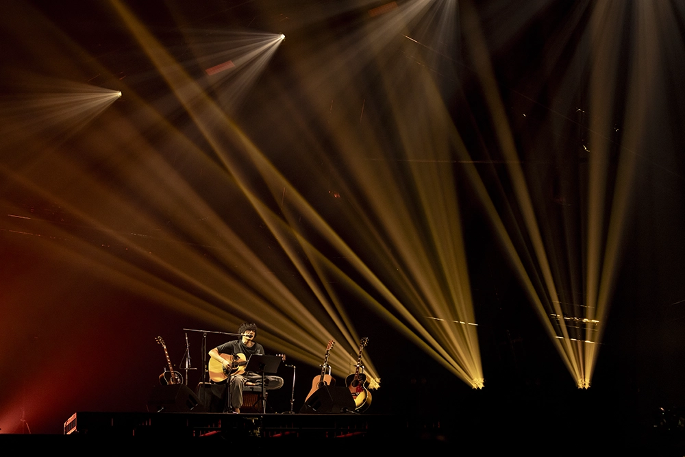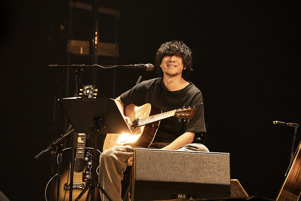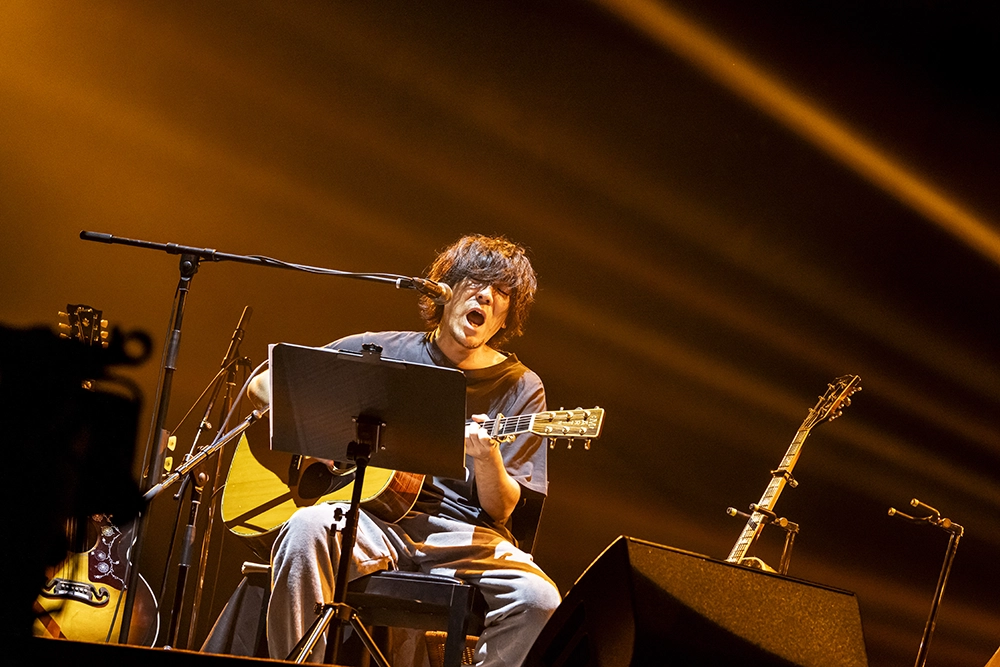 広いステージのほんの一部、小さなライブハウスの舞台ほどのスペースに、アコースティックギター4本と椅子とマイクと譜面台。開演時刻ちょうどにふらりと登場した依与吏が、照れ笑いを浮かべながら話しかける。黒Tシャツ、ラフな綿パンに裸足。部屋着感がすごいが、おもむろにギターをつかんで歌いだすと空気がガラリと変わる。静まり返った場内に響き渡る歌声の圧倒的なパワー、抒情、表現力、説得力。曲は「恋」、そして「東京の夕焼け」。弾き語りだから生き物のように、呼吸に合わせて曲が伸び縮みする。歌詞に合わせてオレンジ色の照明が主役を照らす。スクリーンに映る表情と歌に集中していると、アリーナ後方にいることを忘れてすぐ近くで歌われているように感じる。