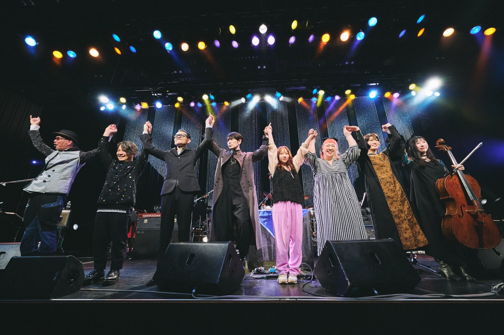 メンバー全員で記念撮影を終え、はけて行くメンバーも呼び戻して、8人で横一列で手をつないで挨拶。ケーキに指をつっこんでひと口なめ、「うまっ。うまし!」と叫んだり、改めてお礼を言ったり、みんなの帰り道を気遣ったりして、ひとりになってもしばしステージに滞留していたのは、2日間のライブは終わったが、なんだかまだ立ち去り難い気分だったから、かもしれない。
