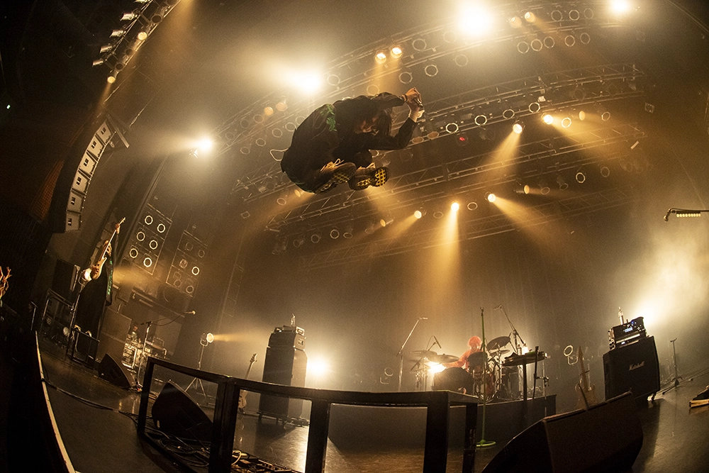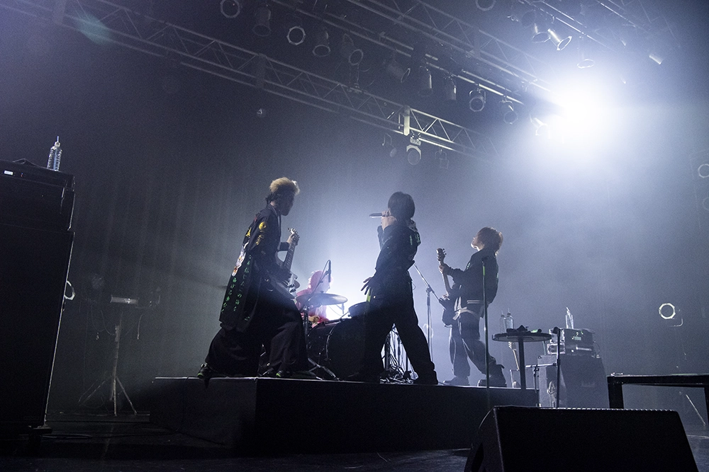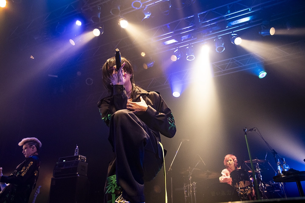 暗転。ステージにかけられていた黒い幕がゆっくり開いていくと、文(Gt)、義(Ba)、啓(Dr)の3人がすでにスタンバイ。啓のドラムを皮切りに、3人が凄まじいテンションで音をフロアにぶつけていくと、咲(Vo)がマイクを高く掲げて登場。メランコリックで耳に残るメロディを擁した「清純系不純エゴ」でライブをスタートさせると、「ハジメマシテ。」「君、依存、タトゥー」と重量感のあるサウンドを次々に畳み掛けていった。それにしてもステージから放たれる熱量が尋常じゃないほどに高い。オーディエンスもそれに熱く応えていたのだが、まだまだ足りないと言わんばかりに「東京で一番治安の悪い場所はO-EASTやろが!」と煽り、「乱痴気卍娘」へ。このペースで最後まで本当に保つのだろうかと心配になるぐらい、とんでもない勢いで駆け抜けていく。