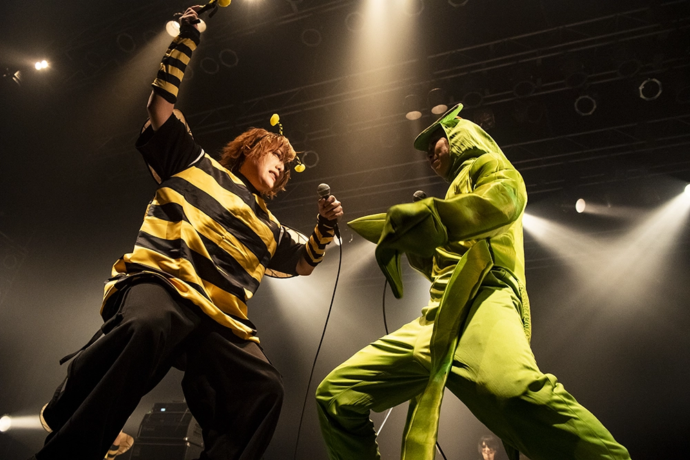 フロアの熱狂を生み出していくメンバー達の個性もかなり強烈だ。文がフロアを見渡しながら要所で耳をしっかりと惹くフレーズを残していけば、ときにイスから立ち上がるだけにおさまらず、ドラムセットに乗って叩いたりと、派手でありながらも一撃がやたらと重たいドラミングで啓が魅せれば、衣装の特攻服が映えに映える気合いの入ったリーゼントヘアの義は、ステージを動き回りながらも堅実なプレイでボトムを支える。個性的な楽器陣による、爆発力はありながらも安定した演奏を背中に受け、フロントマンの咲は全身全霊で歌をフロアに放つ。お立ち台に直立し、グロウルやファルセットなど様々な歌唱法を使い分けて闇の世界へ誘った「アマイドグマ」や、「嫌いになってください」をはじめとした歪んだ愛とも、愛ゆえの暴走とも、ある意味純粋とも言える楽曲への入り込み具合はとにかく圧巻。なかでも「故に、ドエス。」で見せた情緒不安定ぶりは真に迫るものがあり、恐怖を感じさせるほど。毒々しすぎる言葉でフロアを煽り倒すと、「ミナゴロシ」へ突入。オーディエンスは激しく頭を振り回し、叫び声をあげる。「楽しんでますか!?」と声を求めた咲が話す。