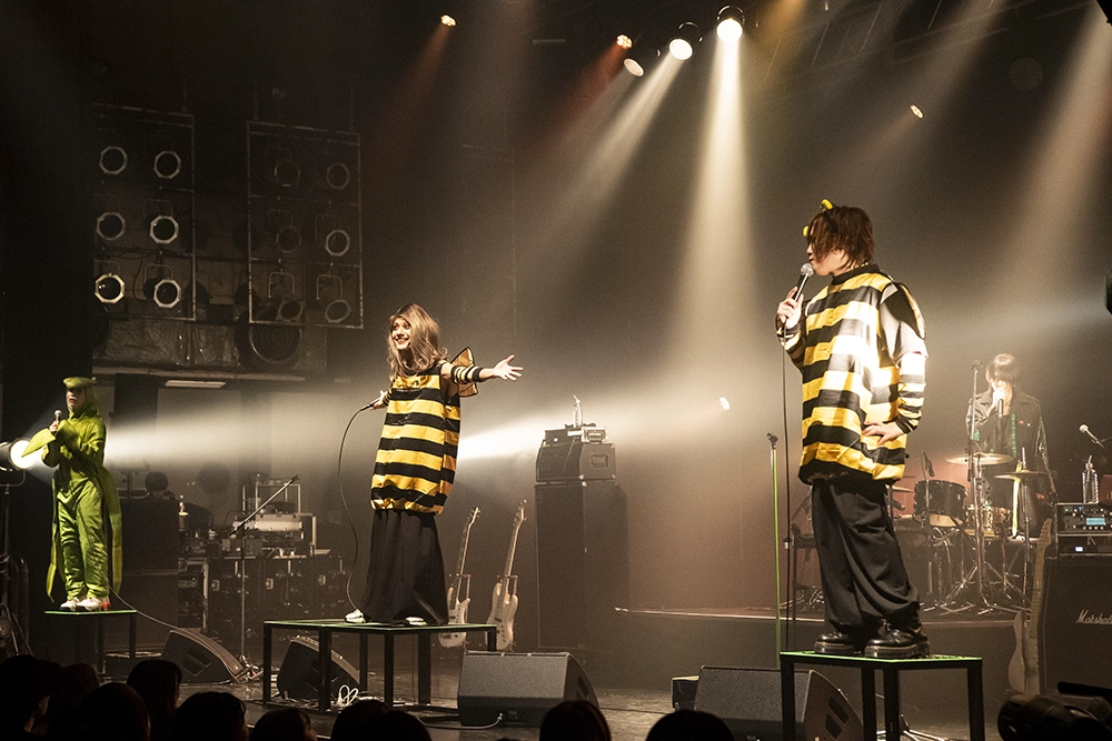 そんなエモーショナルなステージから打って変わって、メンバーによるコミカルな“茶番”も彼らのライブの魅力のひとつ。この日は8周年記念ライブということで、蜂(ハチ)を題材にした寸劇が披露された。いろいろ訳ありで婚活歴8年目に突入したハチコ(義)に、イケメンで優しいけどちょっと頼りなさそうなハチオ(文)が声をかけていたところ、高身長・高収入だけど自信満々なところがちょっと引っかかるカマキリ男(啓)が乱入。ハチコを巡ってハチオとカマキリ男が争い始めるのだが、ハチコが男性を選ぶ際に重要視しているポイントは「いかに思い出を大切にしているか」だということで、咲の司会進行のもと、甘い暴力の歴史を振り返る「8年の間であんなことやこんなことがあったんでしょうかクイズ」になだれ込むという展開でフロアを盛り上げていた。そして、“茶番”のポップな空気を増幅させるように、「絶対純愛光線」ではフロアが一体となってキュートな振付で踊り狂えば、「元気もりもり100%」では“オラに元気をわけてくれ!”という某アニメの名台詞が流れると、メンバー達が元気玉ならぬカラーボールをフロアに投げ込み、オーディエンスも喜ばせていた。