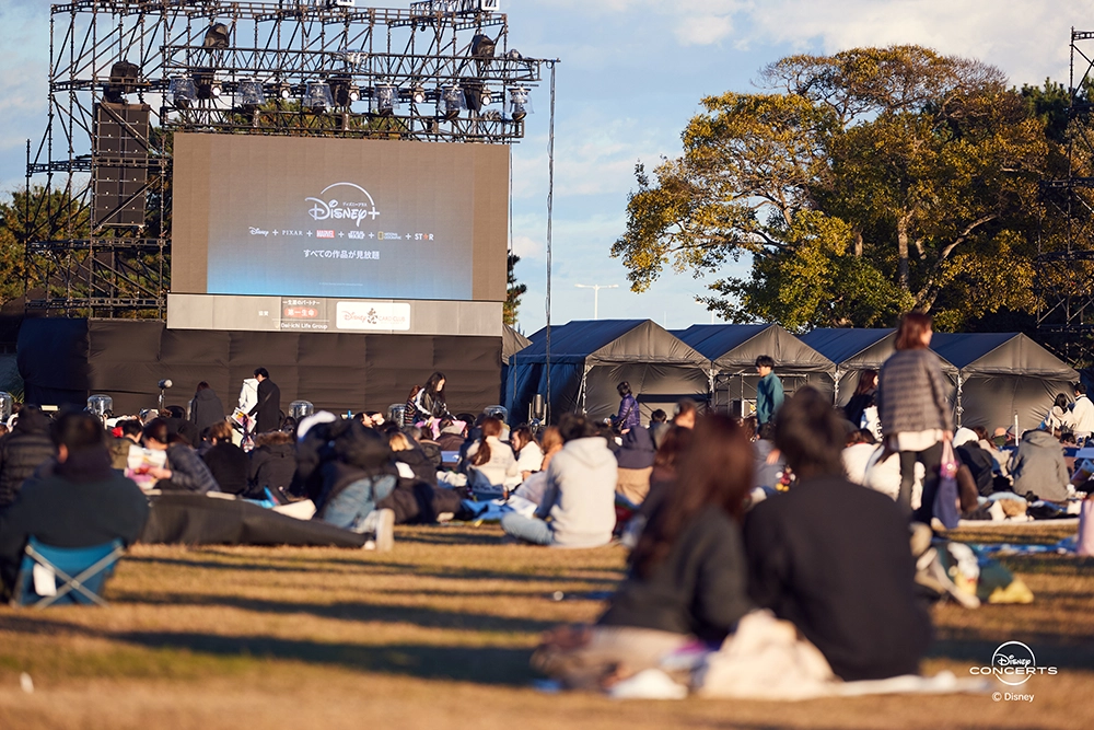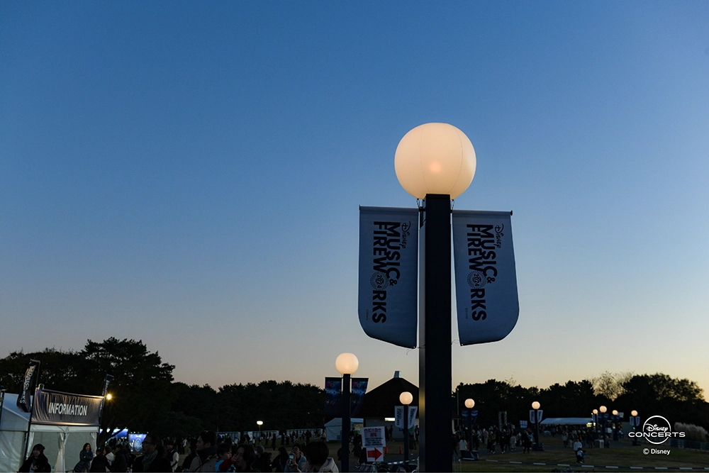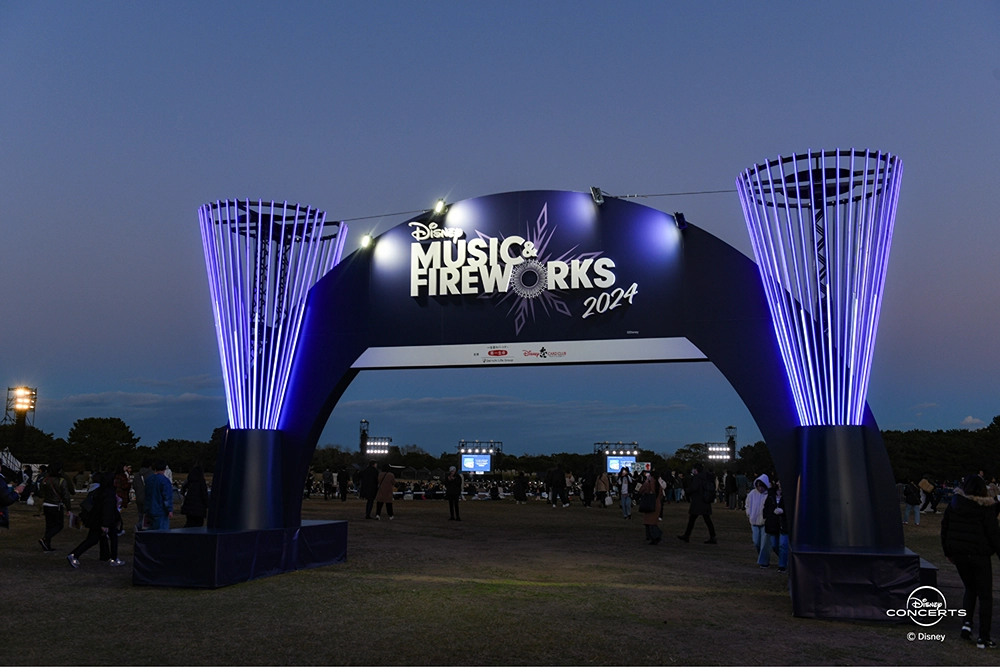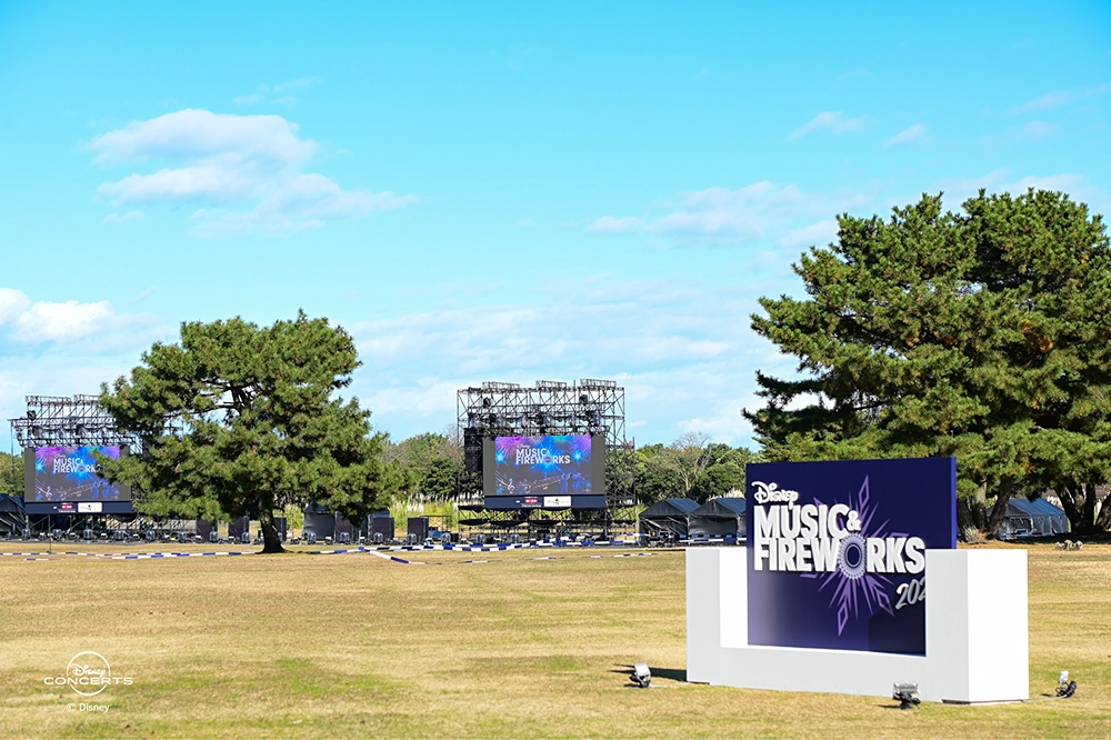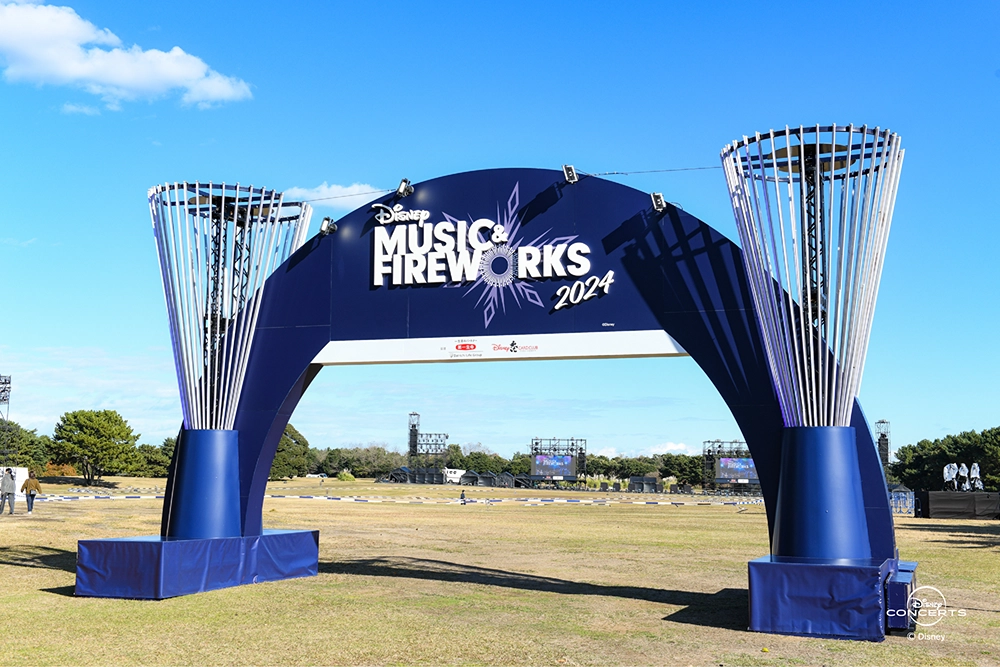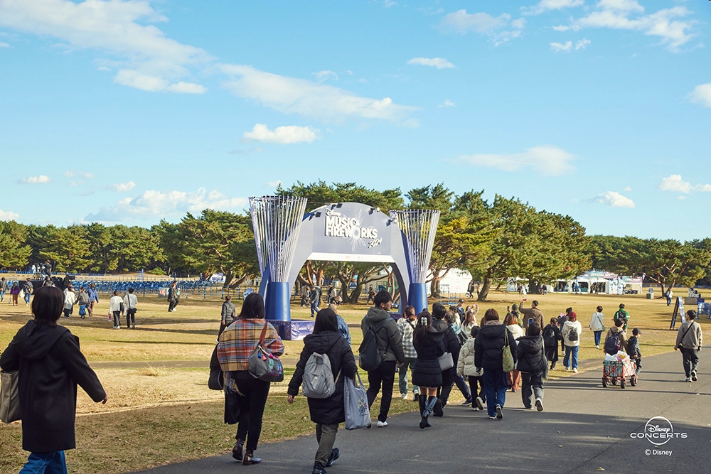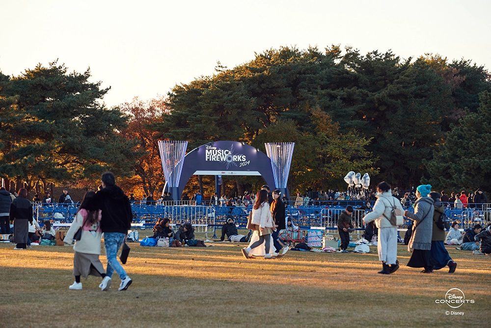 「ディズニー ミュージック&ファイヤーワークス 2024」のファイナルを飾る会場は、茨城・国営ひたち海浜公園。早くも春のネモフィラに向けた準備が始まっている広大な公園の中央に位置する草原エリアに続々と集まる来場者たち。明るい時間から訪れ、会場内のあちらこちらに設置された数種類のフォトスポットで記念撮影をしたり、オリジナルグッズを購入したり…開演までの時間からすでにディズニーの魔法のような時間を体験できるのも、「ディズニー ミュージック&ファイヤーワークス 2024」の魅力のひとつ。