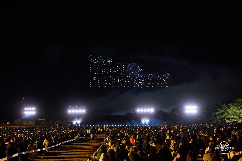 セクション6《フィナーレ》は、今回のショー全体の音楽編集を手がけた浅倉大介(音楽プロデューサー、ミュージシャン)の手腕が特に光った。「トライ・エヴリシング」(『ズートピア』)、「本当のわたし」(『ミラベルと魔法だらけの家』)、「パート・オブ・ユア・ワールド」(『リトル・マーメイド(実写版)』)、「サークル・オブ・ライフ」(『ライオン・キング』)、「レット・イット・ゴー」(『アナと雪の女王』)と、さまざまな映画からジャンルの違う音楽がシームレスに紡がれた圧巻のメドレー。ラストは、夜空から雪の結晶が降り注ぐかのような光景が目の目に!各曲に込められた感情を見事に表現した花火が、来場者の心を大きく揺さぶった。さらにはこの茨城最終公演のサプライズ演出として、ドローンによる消えることのない花火を思わせるような表現でさらなる余韻を感じさせたのちに、エンディングとなるインストゥルメンタル曲「ヴェリィ」が流れ始めると、このショーのロゴを夜空に星座のように大きく映し出し、最後の最後までゲストの心を楽しませた。