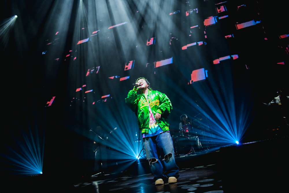 舞台下手には、こっちのけんとの家から搬入した私物を並べて、その当時の部屋のなかを再現したセットが登場。NIKEのジャージを着て椅子に座ったこっちのけんとは、ライムカラーの懐かしのスケルトンiMacの前に構え、自分の声をリズムやベースに分けていって一人多重録音状態で作ったバックトラックを流しながら、Vaundyの「踊り子」、New Jeansの「Ditto」、菅田将暉の「惑う糸」、Creepy Nutsの「Bling-Bang-Bang-Born」というとんでもなくタイプがかけ離れた楽曲たちを少しずつ歌唱。ここでは歌以上に、声を編集して作り上げたトラックのセンスにことごとく驚愕。ひとりアカペラ時代にこうして曲を細部まで分解して、曲を自分の解釈で再構築していったことは、その後の彼の曲作りに大きな影響を及ぼしていったに違いない。いまのこっちのけんとを作り出した重要な時代でありながらも、「踊り子」を歌い出したとき、こっちのけんとは一人アカペラ時代の心境に思いを馳せて、涙がこぼれないように上を向いたり、何度も何度も指で涙を拭う仕草を見せていたのだった。