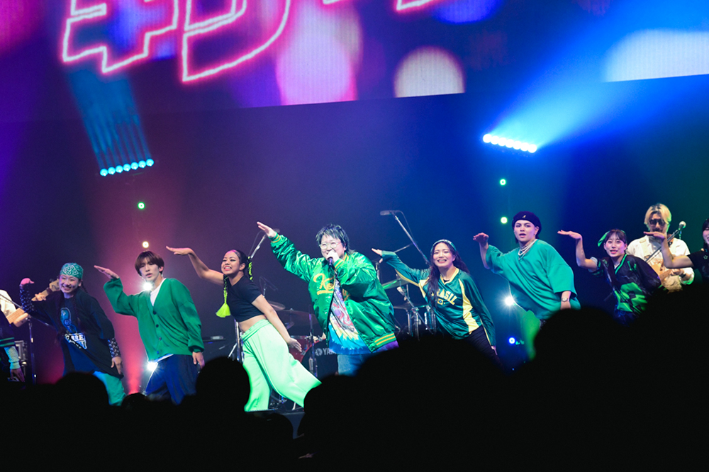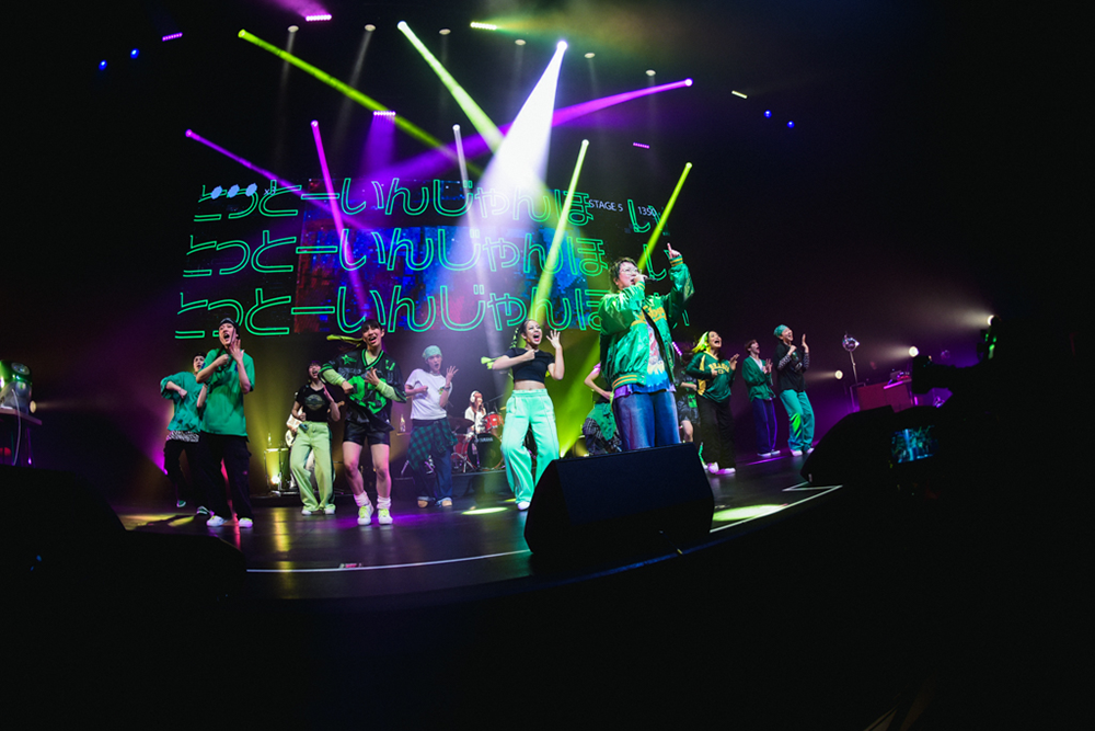 緑カラーの洋服やライトを持った幅広い年齢層が集った客席に向かって「さあ、みなさん立っちゃって!」と合図をおくると、これまで着席していた観客は総立ち。ペンライトを振ったり、クラップをしていた客席が、サビが始まると子どもから大人までテルメルダンスを一斉に繰り広げる! この人の楽曲が、どんな世代にもキャッチーに届いていることを、このライブが証明している。このあとは「鬱になった経験をメモしてたので、そのときの気持ちを綴った歌」という曲紹介から「死ぬな!」へと展開。この曲が聞き手の琴線を激しく震わす理由。それは、サビに歌い込まれた“願い事3つ考えろ”というフレーズの存在だ。絶望や後悔のなか、羽交い締めになった感情で、もうなにもかもやめたい、消えていなくなりたい、全部終わりにしたいと思った人に対して「この先なにかいいことがあるから」という曖昧な言葉の100倍、説得力を放つこの1フレーズ。これを、押しつけがましくならないよう、生で聴くとより身体が踊り出すようなグルーヴィーでファンキーなバンドサウンドにのせ、明るく軽やかに歌っていくところがこっちのけんとが人気を集めた理由だろう。次の「ビバ・イナイイナイバァ」は、ノリノリの楽しいロックンロールにのせて、赤ちゃんみんなが笑顔になる魔法の言葉“いないいないばぁ”を使った言葉遊びがつまった歌詞で、辛い悲しみを抱えて泣いている大人たちを笑顔にし、日々努力を続けている人たちに“あとちょびっと力を抜いたら金メダルさ”と彼しか書けないフレーズでエールを送っていく。実体験をもとにした人間味のある共感性の高い歌詞はこっちのけんとの大きな武器。どんぐりの背くらべをポジティブにとらえた「どんぐりGAME」では12人の宝仙学園高等学校のダンサーたちが舞台に集結して、ステージはいっきに華やかさを増す。“どっとーいんじゃんほい!”、“みなさんごいっしょに、ひ、ふ、み。”や“はい!”の合いの手など、みんなで楽しめるキャッチーな掛け合いてんこ盛りのこの曲では、こっちのけんともダンサーと一緒になって踊りながら、ダンスはそれぞれ違っていてもみんな同じただの人間であるという歌詞の本質を、パフォーマンスでも伝えていった。